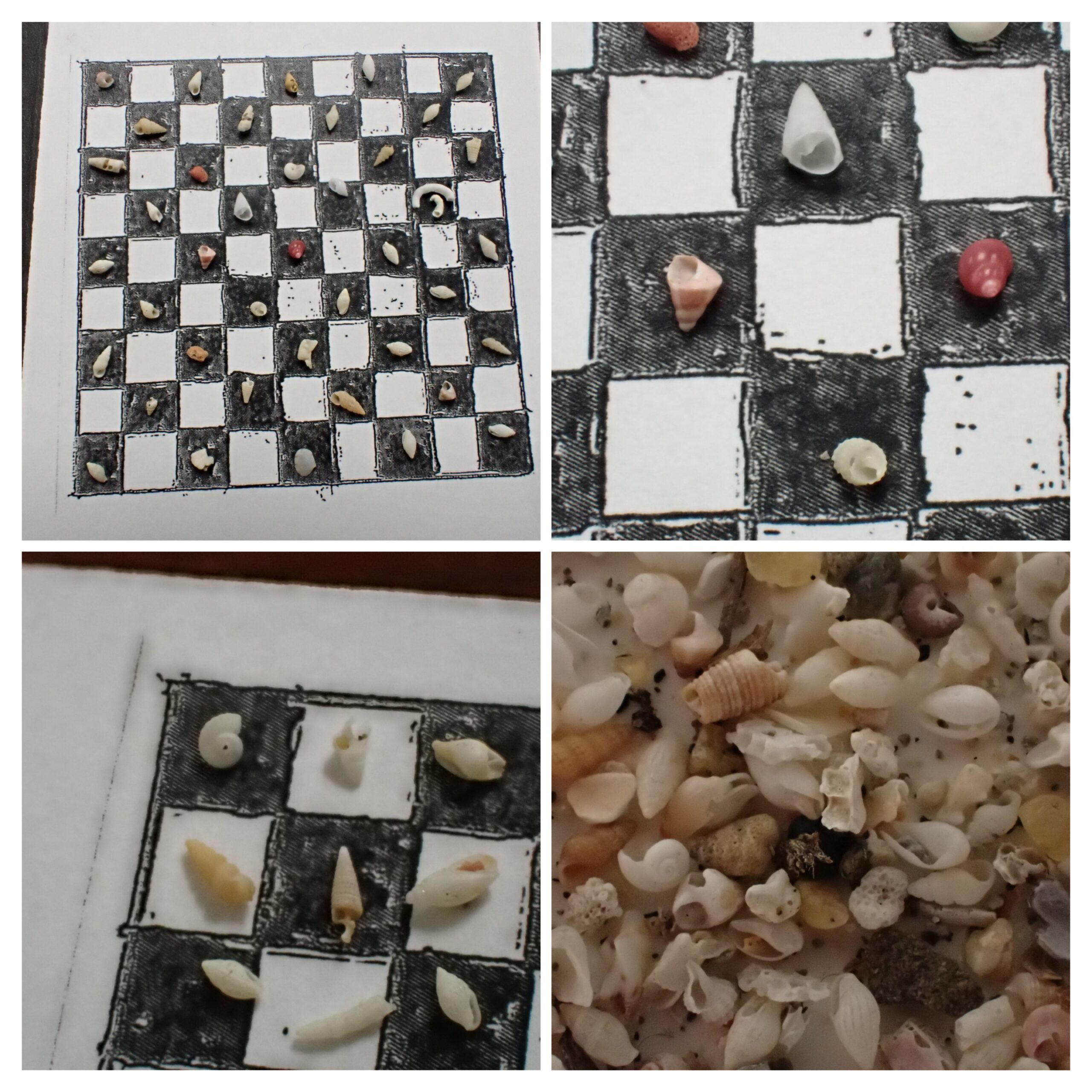 さあ、次はいよいよふるい落とされた微小貝を探す。ルーペを見ながら慎重にピンセットでつまんでは白黒シートの上に並べる。1~2ミリのなんと小さく、なんと種類の多いことか。そしてほぼ巻貝。なぜ?それは巻貝(微小貝)の構造上の特徴にある。8000メートルを潜る探査船ができたおかげで水深3000メートルの海底から多くの微小貝が見つかっているがすべて新種(今まで誰も観察したことがなかったので)。その姿もようやくわかってきたのだが、その貝殻の芸術的ともいえる繊細な彫刻の美しさ。そして強さ。ドラム缶をもつぶす深海の水圧に耐えられるような構造になっているのだ。小さな貝になるほど、その彫刻も複雑になっているとか。こんなにも小さな貝がこんなところでこんなふうに生きていたなんて、まさに「今まで一度も触れたことのない世界に触れてみた。」