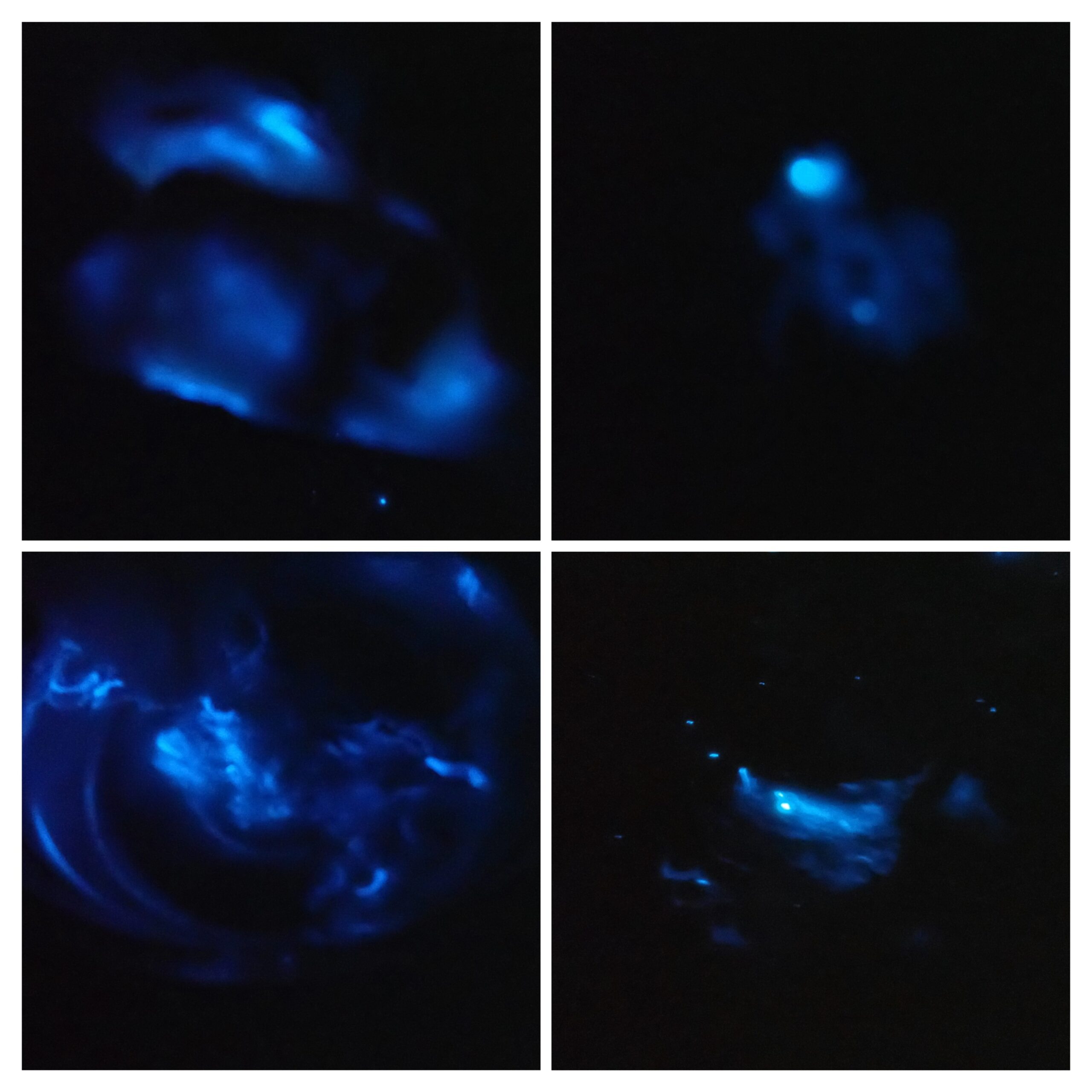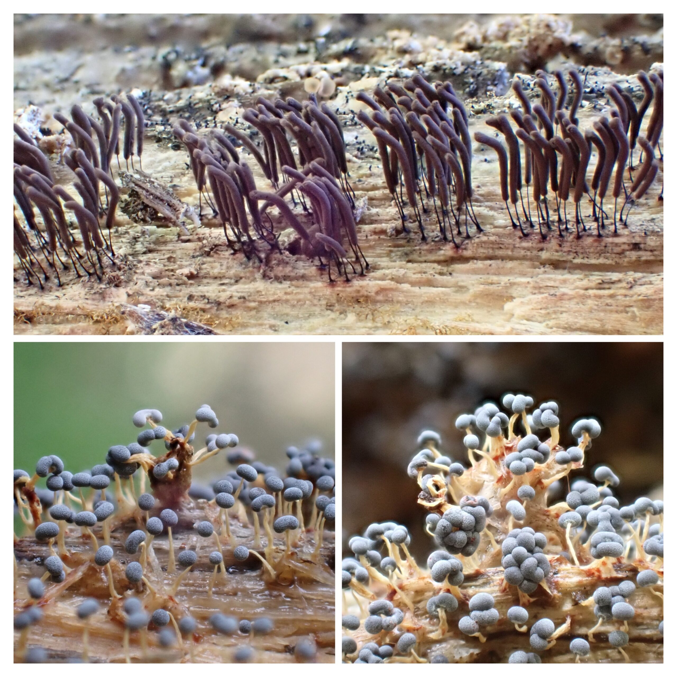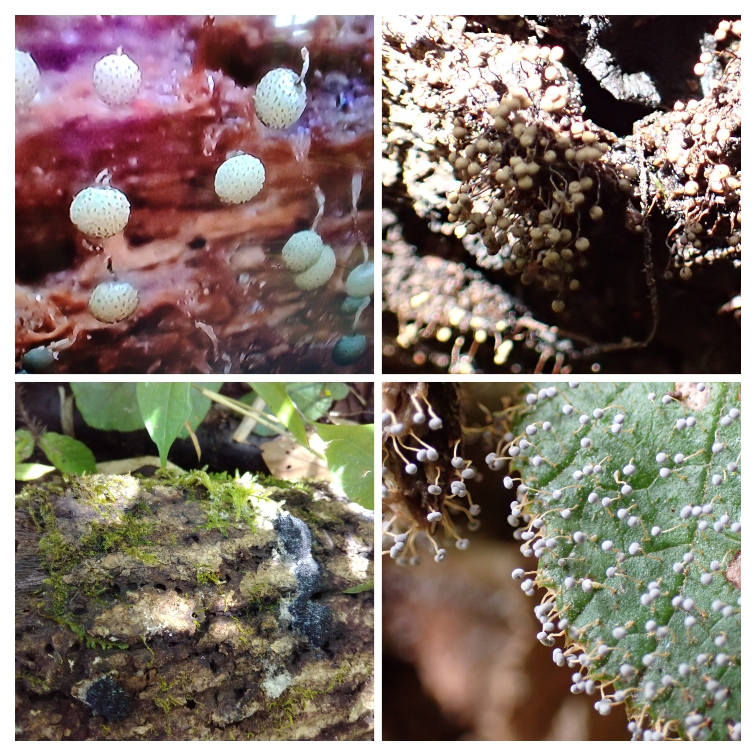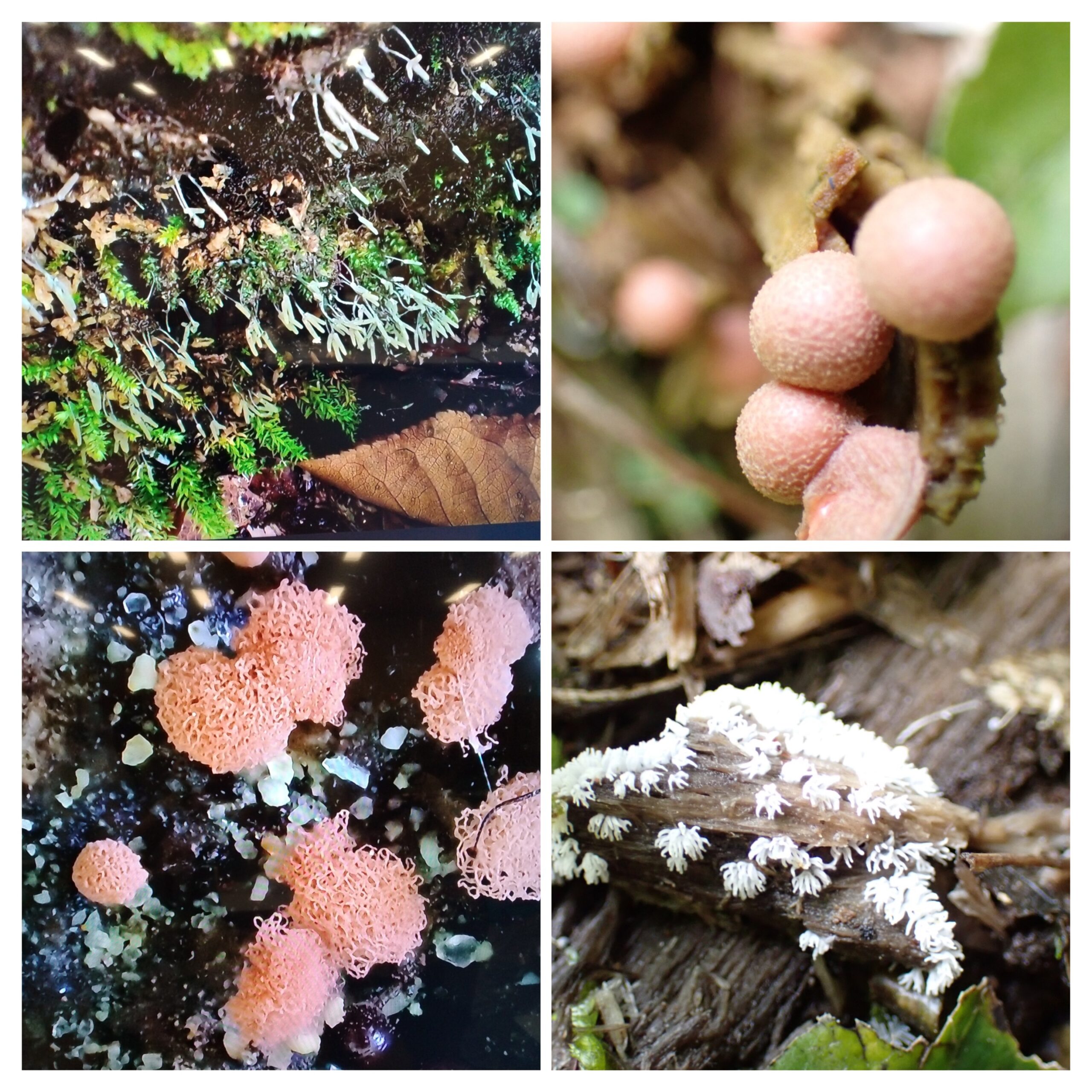 左上からフシアミホコリ?、ススホコリのなかま、アミホコリ、モジホコリのなかま