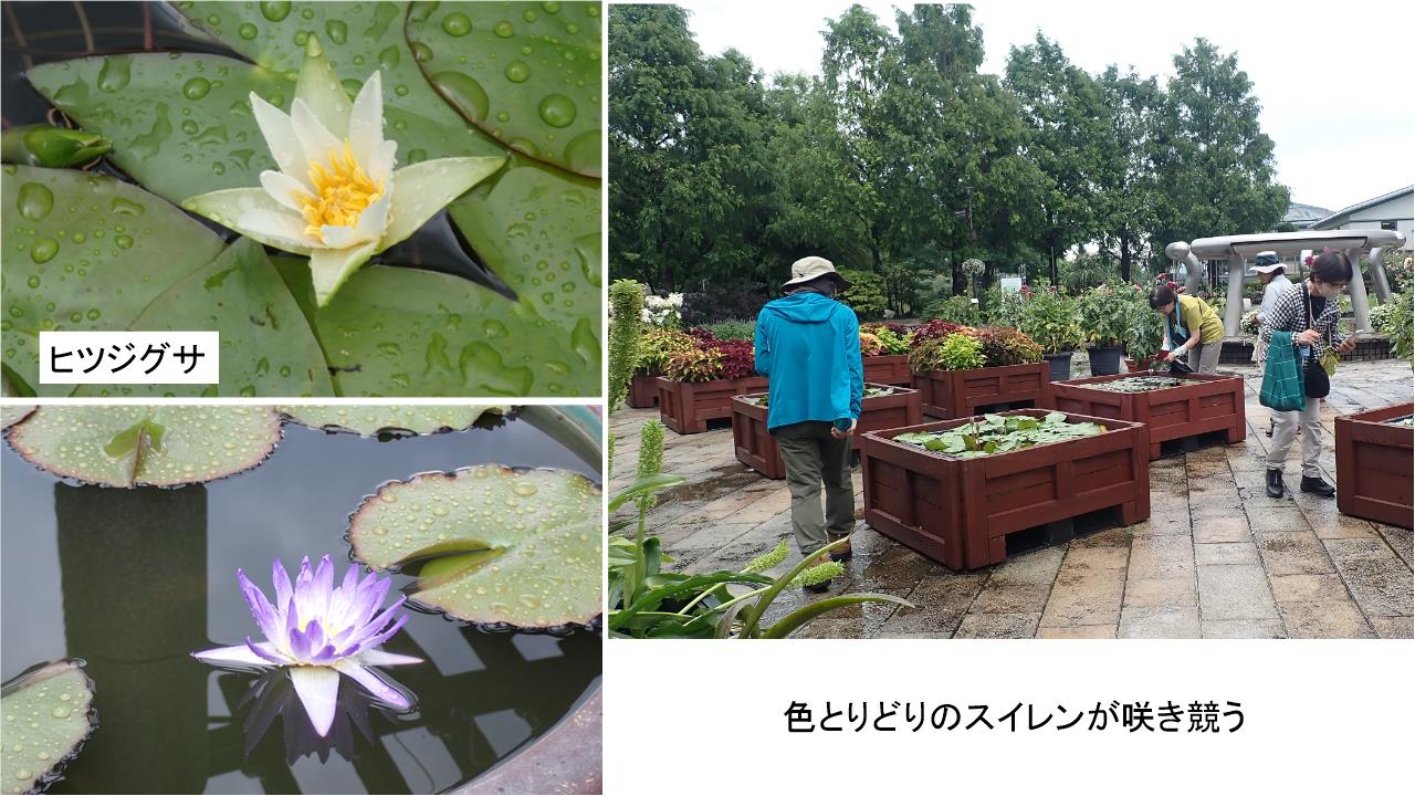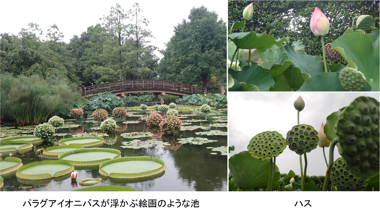 最後に水性植物公園みずの森。ハスやスイレンの花が見頃でヒツジグサの名の由来は未の刻に咲くことからきているといわれるが、その名のとおり開花しているのが興味深かった。一方午前中に咲くというハスは花を閉じていた。ハスの花は水面より高く、スイレンは水面近くに咲くという花の時期ならではの見分け方を知った。温室や手入れの行き届いた池に浮かぶパラグアイオニバスや色とりどりの花を楽しむことができた。