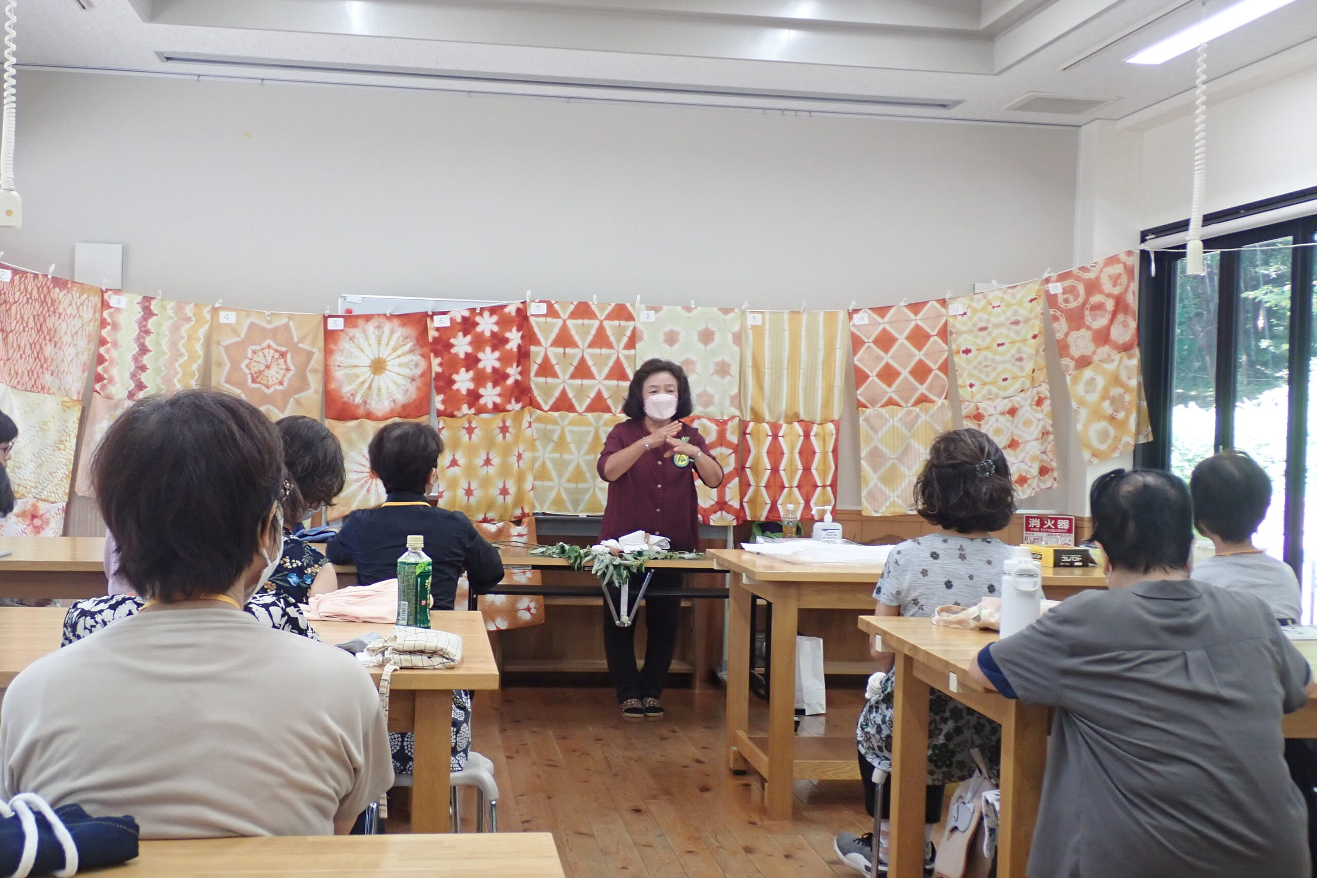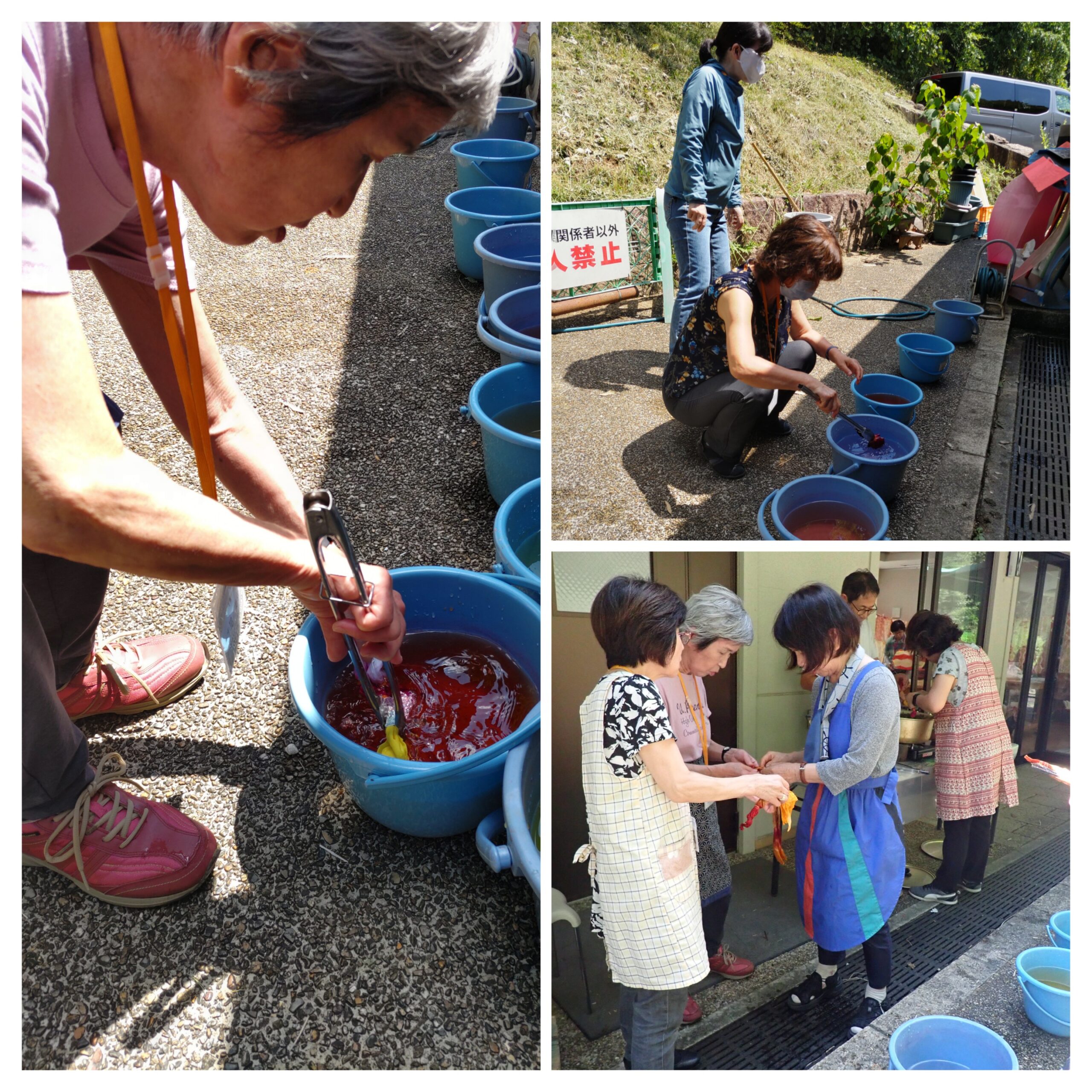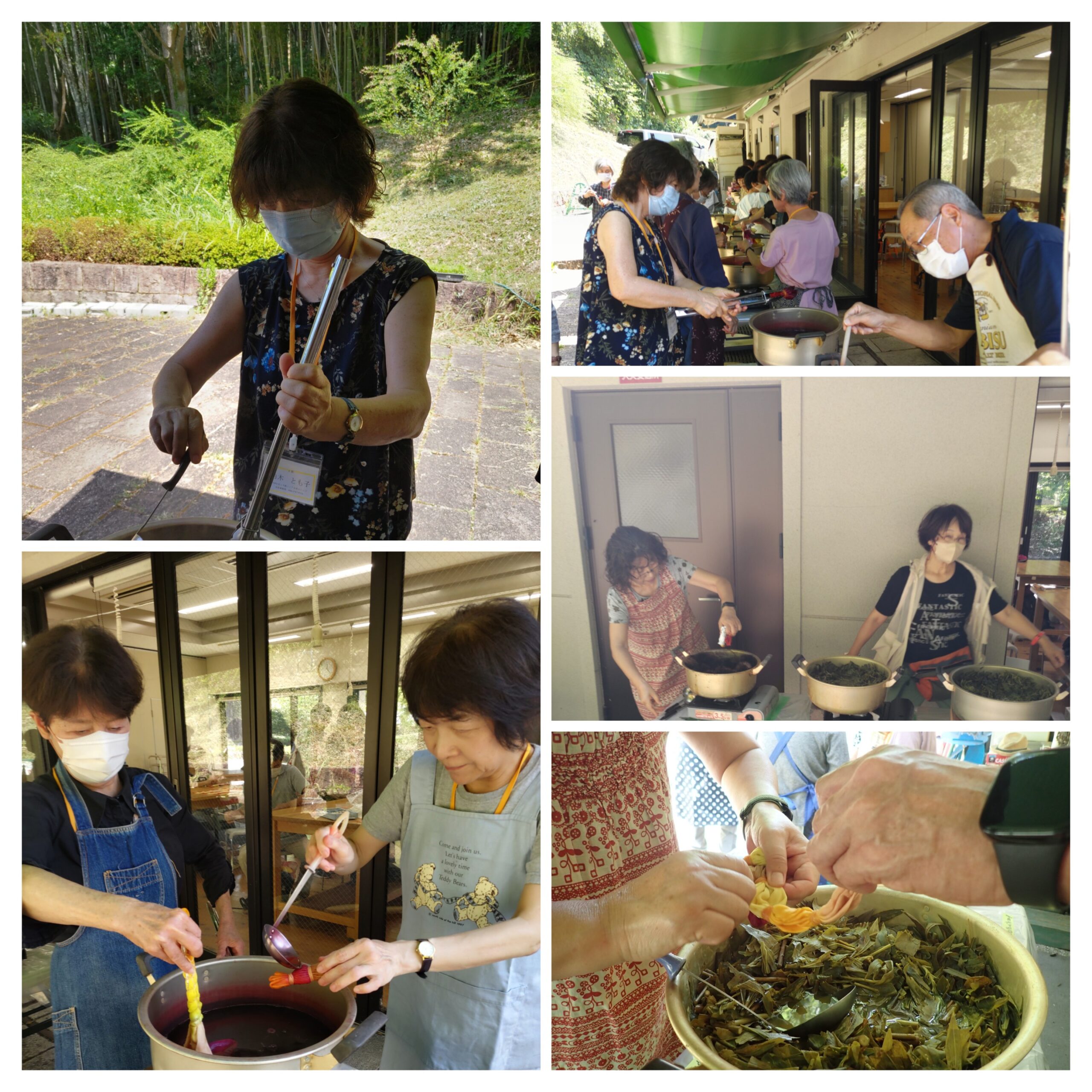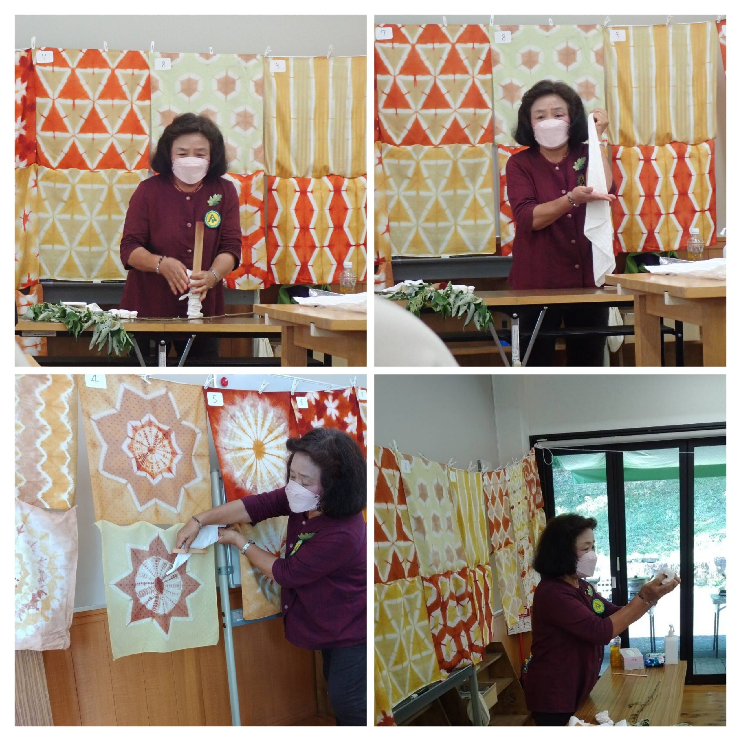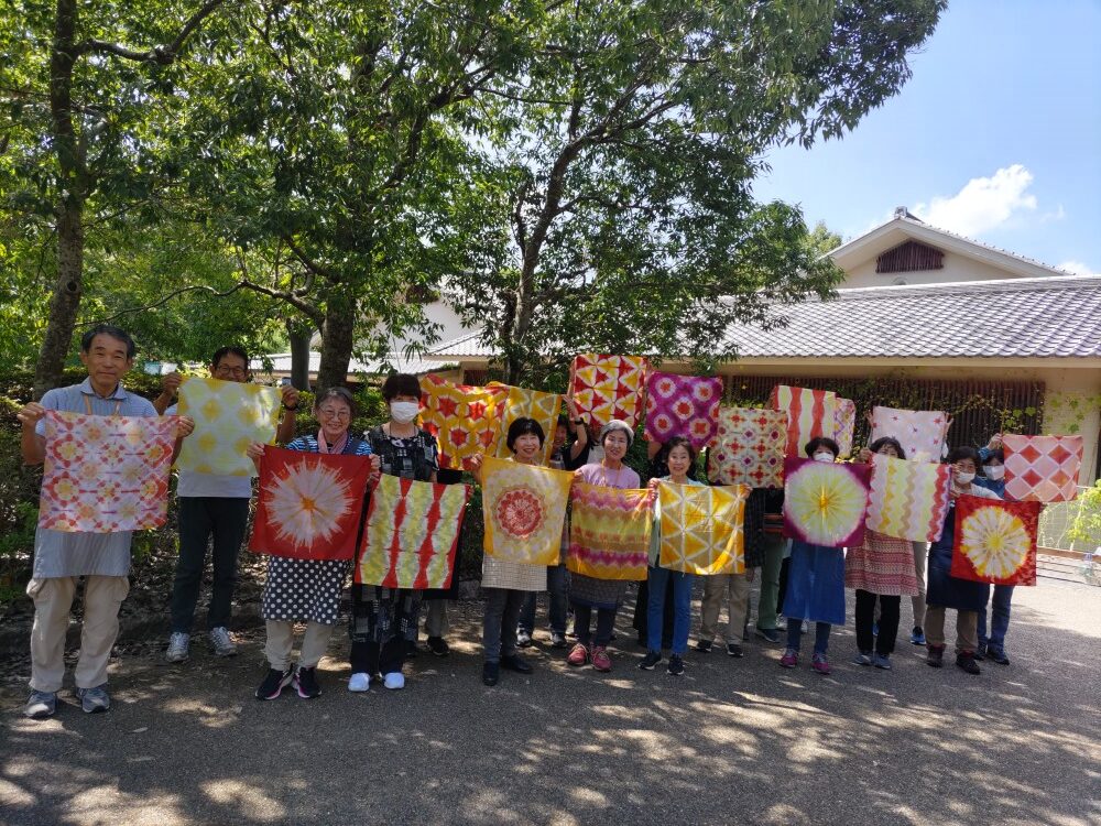 次に6種の植物を煮出した染料に染める部分ごとに漬けて水洗いし次の染料に漬ける、折り込んだ布の細部まで染料をしみこませることがコツのようだ。講座生それぞれの色遣いと模様に個性があり、甲乙つけがたい出来であった。
