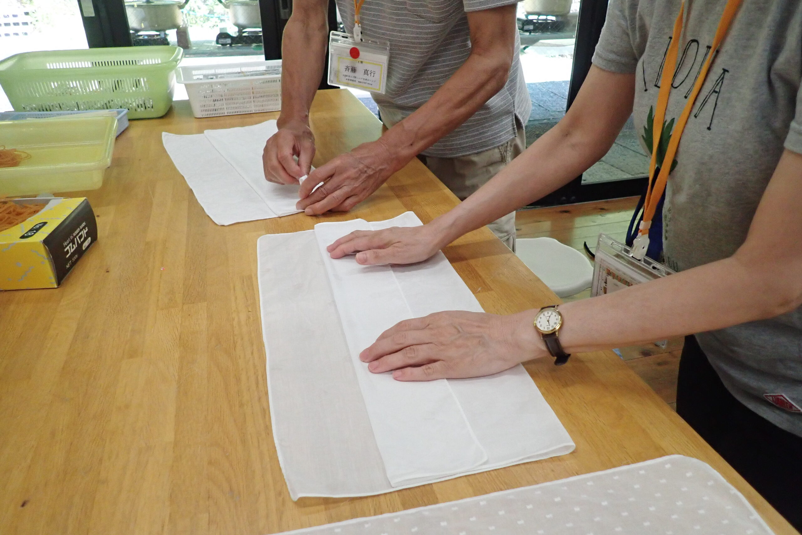 実際に布を折ることから始まった、「なかなか難しいな」