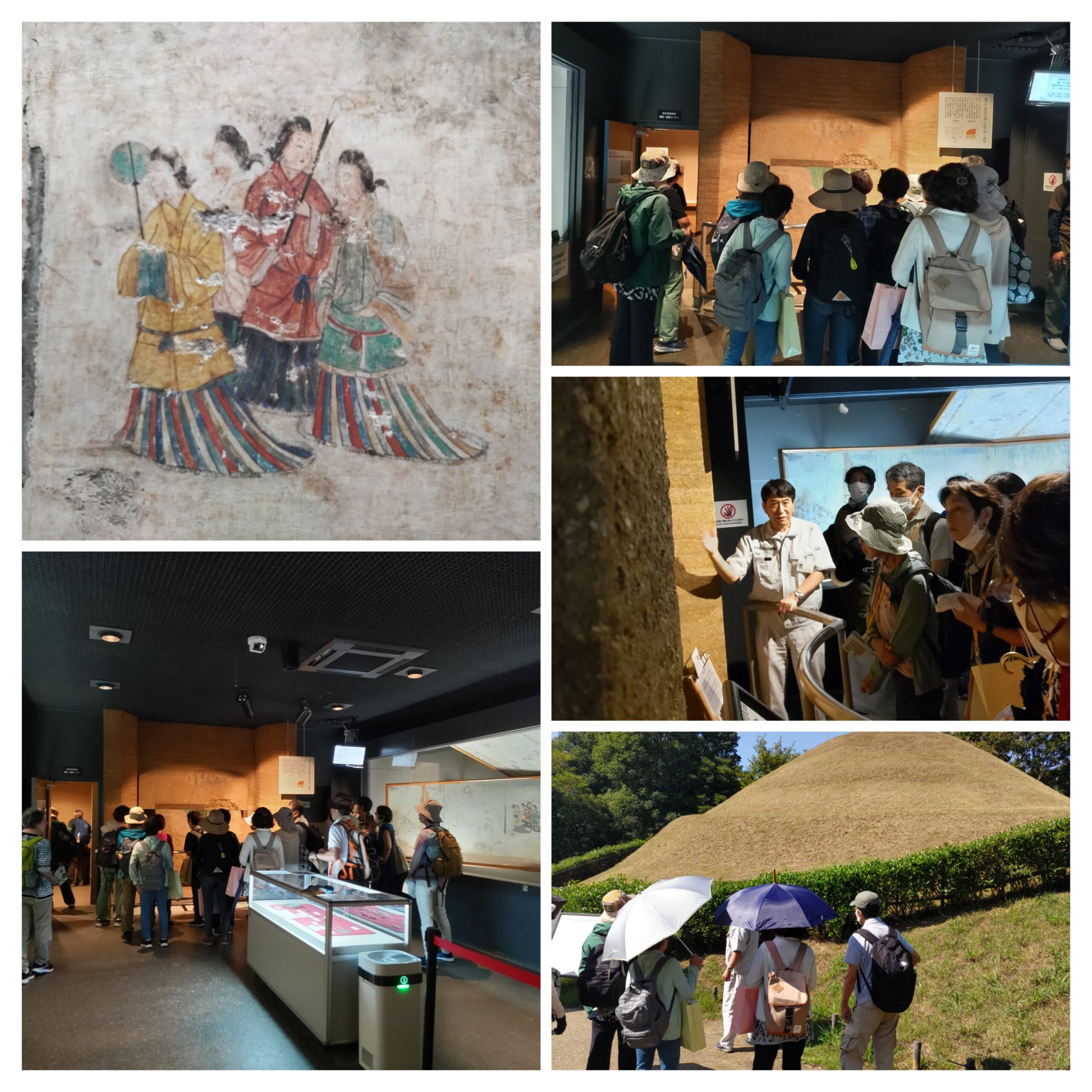 午後からは歩いて10分ほどの高松塚壁画館を見学した。福岡学芸員からしょうがを保存するための穴を掘っていて発見された話や、描かれている人物像や四神の図などの説明を受けた。埋葬品や高松塚の位置関係などから、埋葬された年代や被埋葬者の特定するための様々な検討模様を伺った。