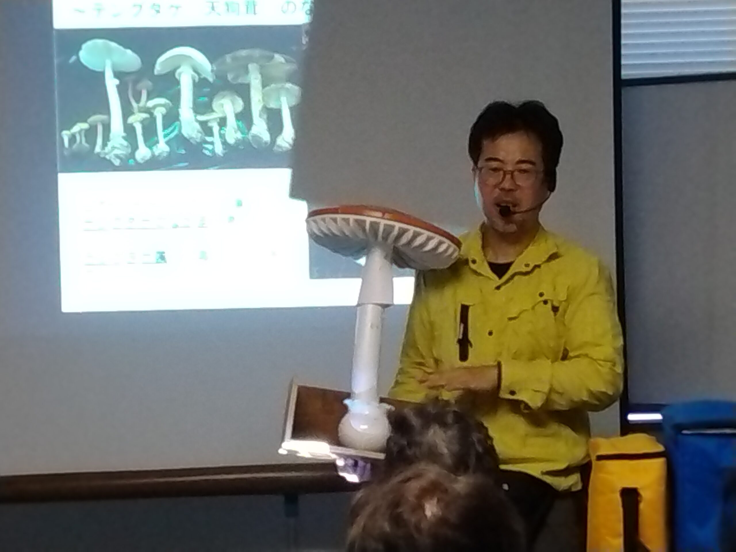 今回は、「きのこ入門」ということで、きのこ超初級の16期1年生。カラフルで豊富な資料ときのこの巨大模型を使って、いろいろな角度から楽しく詳しく興味深く説明してもらった。きのこに対する認識もすこし変わった気がする。自然界の中できのこの果たす役割や、菌根ネットワークの話、きのこと動物や植物との比較など、興味深かった。オマケの菌類利用の最前線の話から、代替肉・代替脂肪・代替レザー・代替プラスチックなど、さらにマイクロプラスチックの問題解決にも一役買ってくれるのではないかと。菌類の力の偉大さを感じた。菌類すごい!マッシュルームウオッチングの楽しみ方も学び、午後からの観察がワクワクするものとなった。