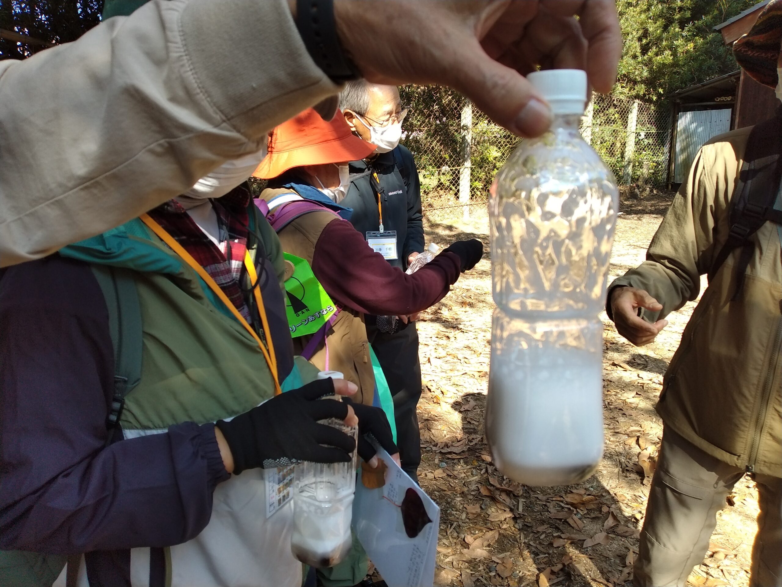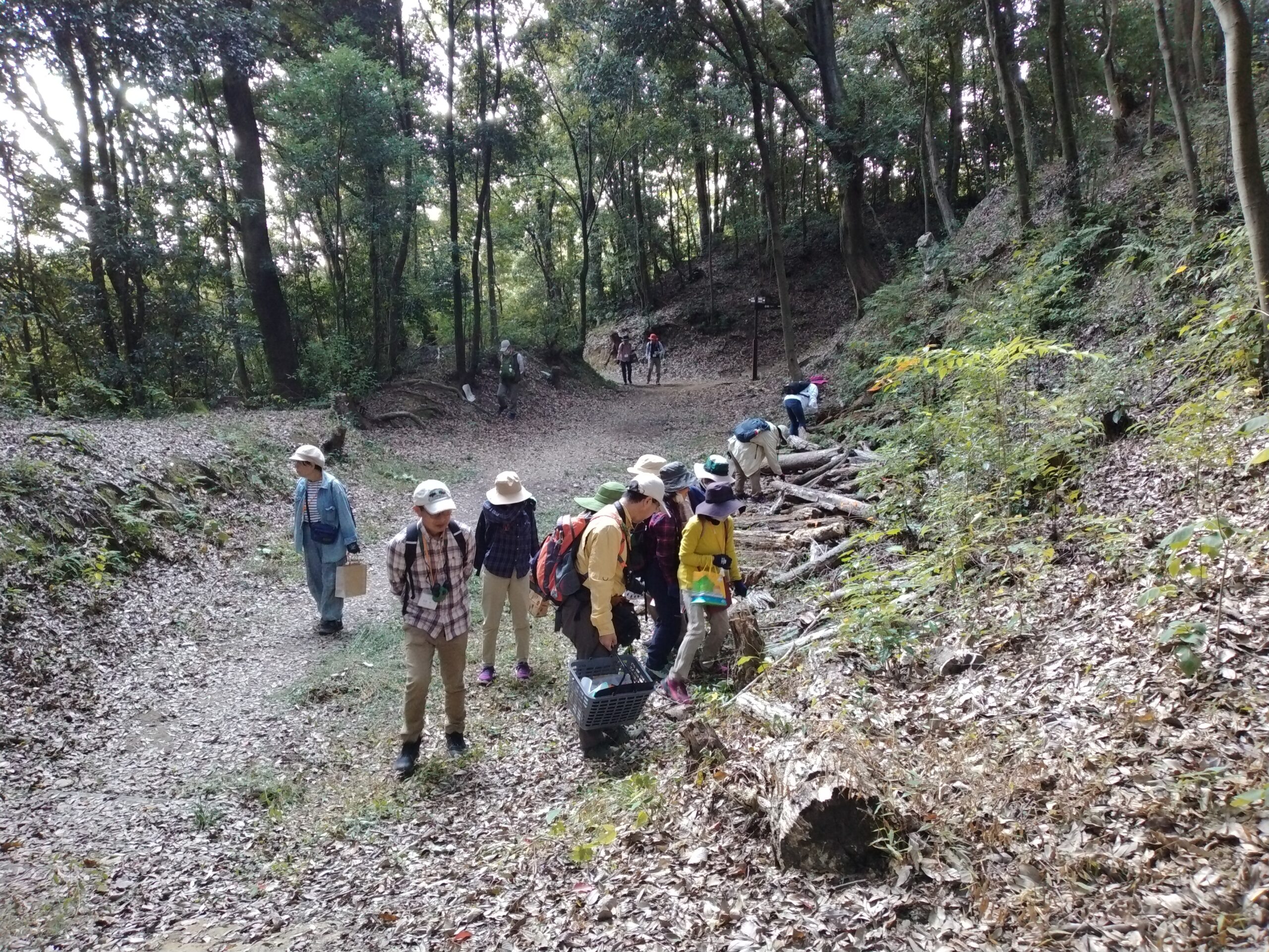 そして、秋晴れの中、趣のある高野街道を歩いて烏帽子形公園へ。うまく見つかるかなあと心配しながら、紙袋と割り箸をもっていざ採集。みんなの熱意の賜物か、途中の烏帽子形神社の祈願のおかげか、1時間ちょっとで30種以上のきのこを観察、採集することができた。「えっ、これもきのこ?」「小っちゃ~い!」「よく、見つけたね!」「きれい!」そしてお決まりの「これ、食べられますか?」の質問に、すかさず「どんなきのこも1回は食べられますよ。」と先生の優しい声。皆さん、2回目は一生ないかもしれないので、毒きのこには、くれぐれも注意してください。(中には、触っただけでも大変なことになるカエンタケもあり)