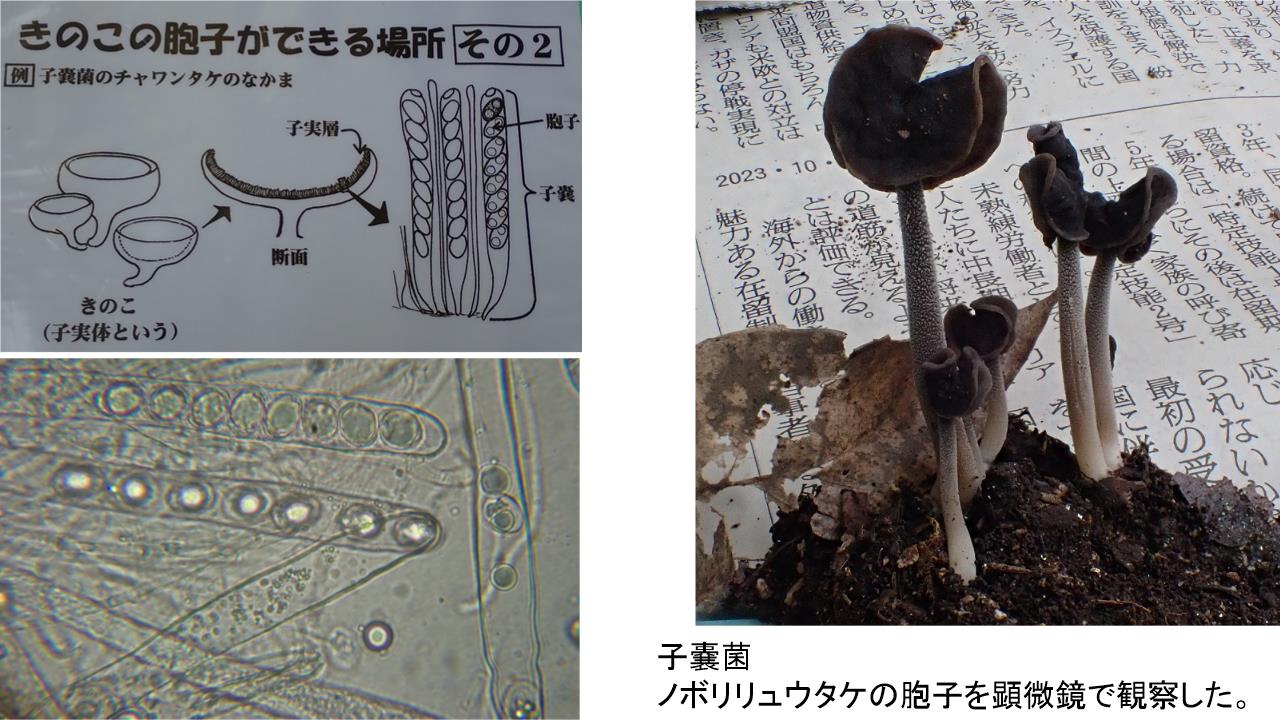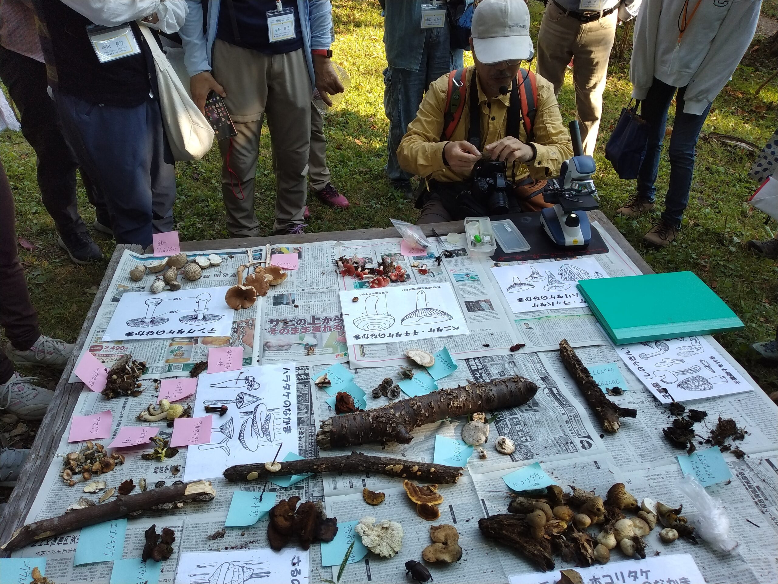最後は、採集したきのこを並べて同定。顕微鏡も使ってクロアシボソノボリリュウタケの子嚢(しのう)の中の胞子も見ることもでき、すっかりきのこの魅力に憑りつかれた秋の一日だった。(K.T)