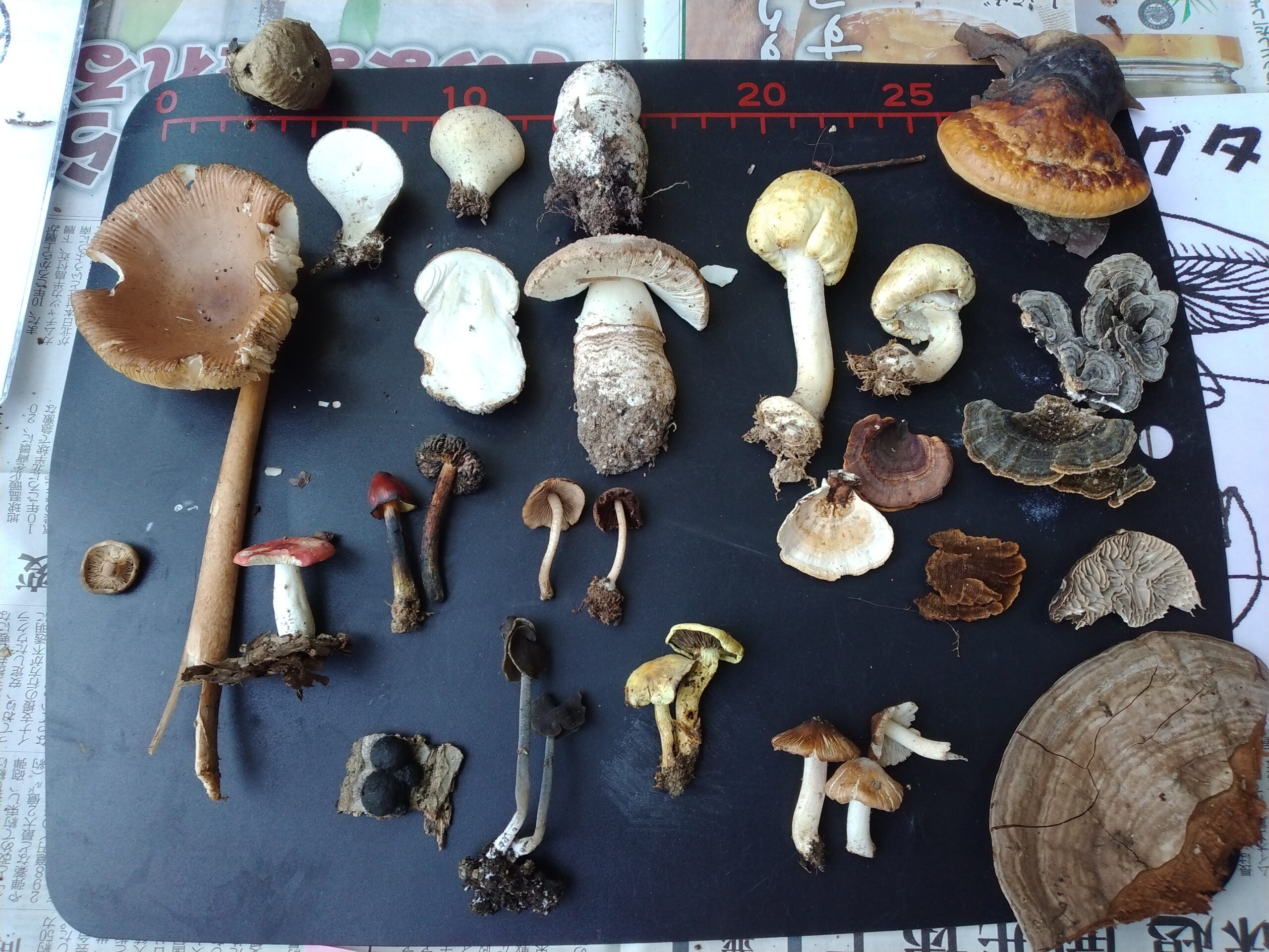 ・テングタケの一種・ベニタケの一種・カバイロツルタケ・ニガクリタケの一種・アセタケ・アカヤマタケ・ハラタケの一種・ムササビタケ・ホウライタケの一種・ウチワタケ・ワヒダタケ・エゴノキタケ・ハカワラタケ・ホウロクタケ・カワラタケ・ウズラタケ・ネンドタケ・カワウソタケ・ニクウスバタケ・コフキサルノコシカケ・ツガサルノコシカケ・アラゲカワラタケ・クジラタケ・ホコリタケの一種・ニセショウロの一種・ノウタケの老菌・クロコブタケ・チャコブタケ・クロアシボソノボリリュウタケ・サガリハリタケ・おまけでムラサキホコリ(粘菌)の一種も見つけました(笑)
