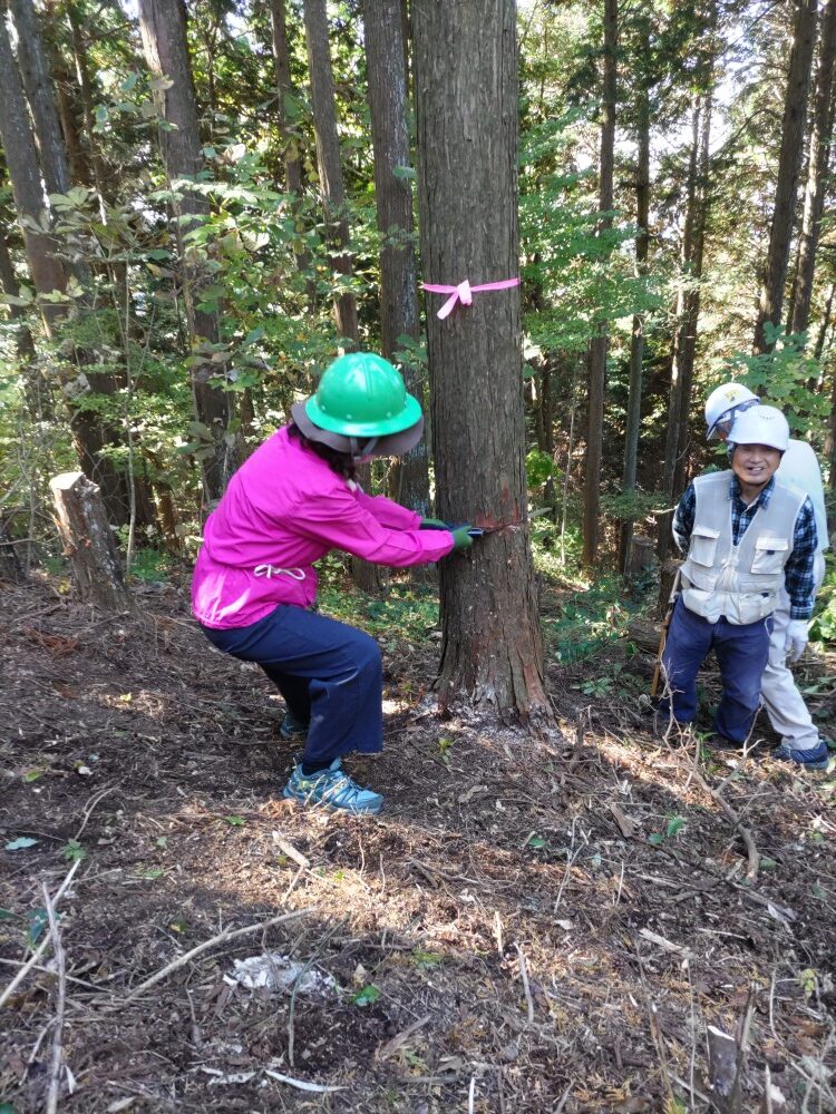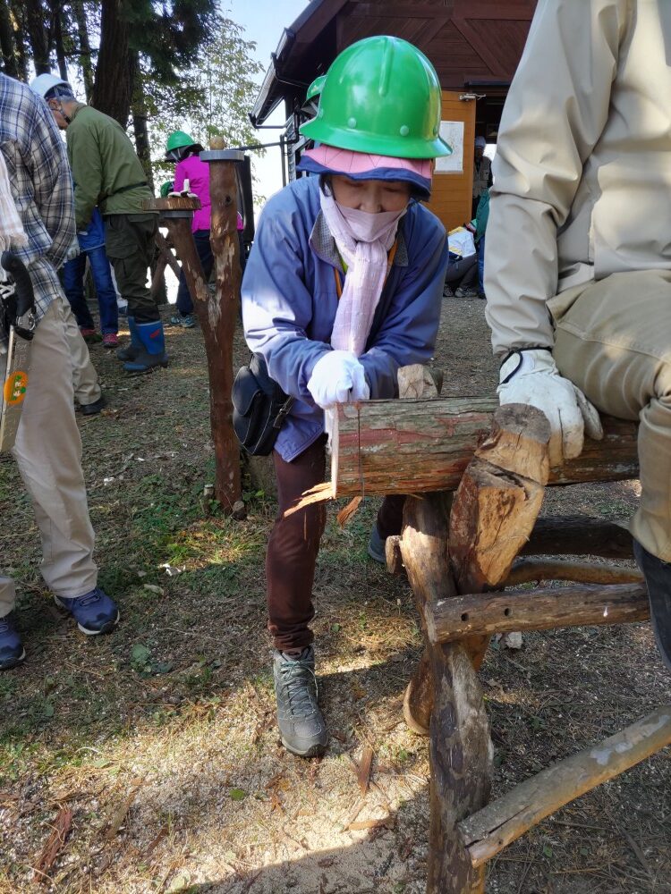 大峰や高野の山並みを見渡せる広場での昼食ののち、愛樹クラブの作業場に移動してヒノキの伐採を体験した。木を倒す方向を決め、倒す方向に受け口を切り、反対側に追い口の切込みを入れる。その後、木に結び付けたロープで引き倒す。交代してノコギリで切込みを入れる実習をするが、斜面の足場やノコギリの使い方が難しく助けてもらうことが多かった。講座生がロープを引き、倒したヒノキの枝を切り払った。
