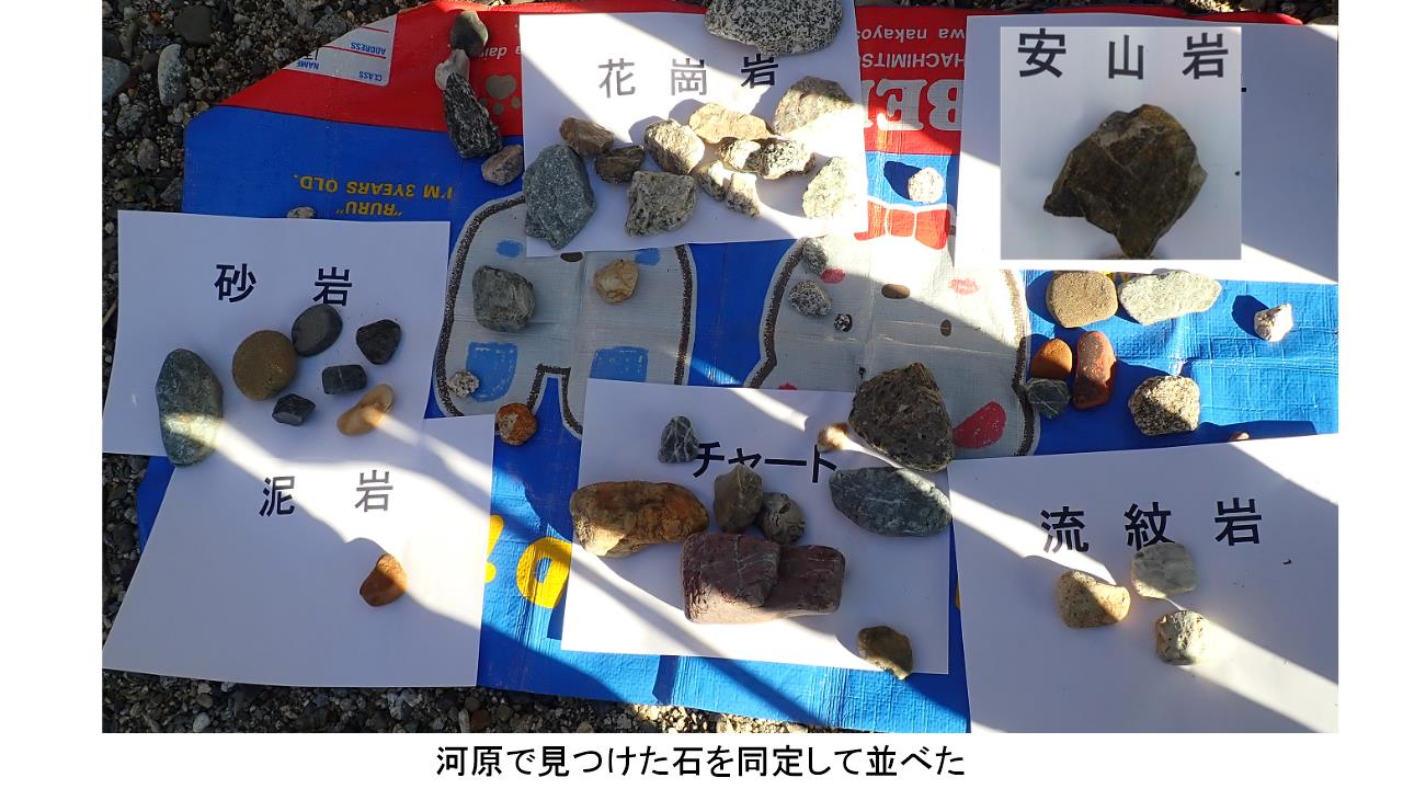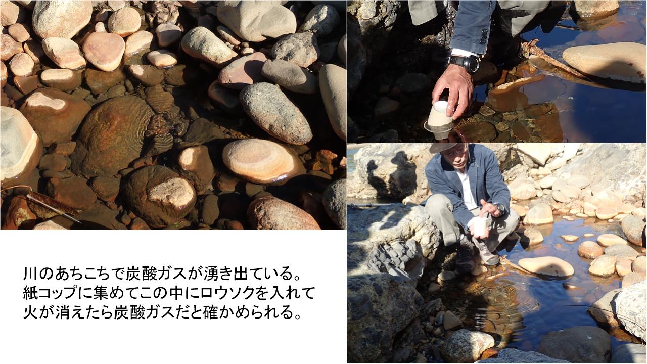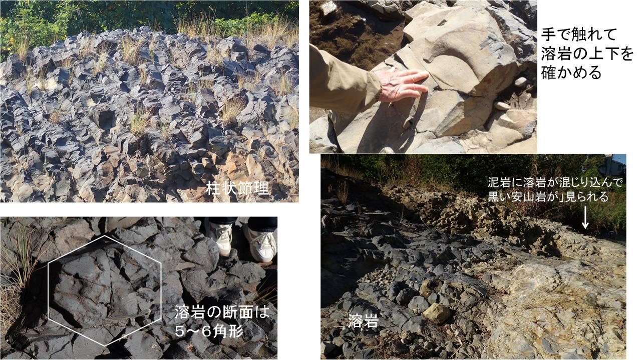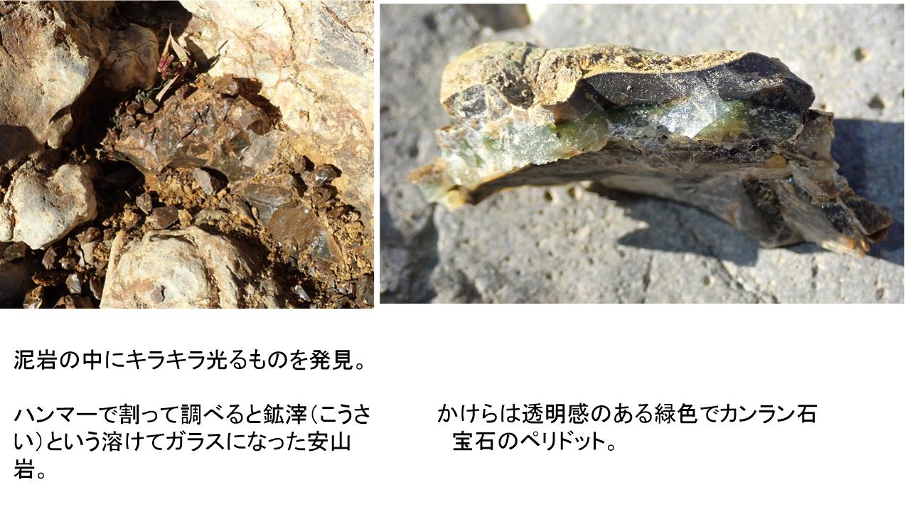 午後は汐ノ宮に移動し、石川の川岸をたどって川の中ほどの溶岩の観察を行った。柱状節理を間近に見、手で触れて上から下へ移動すると滑らか、下から上へは引っかかりがあることを確認した。柱状節理の一辺は約20cmあり、高さはその10倍の20mくらいあるらしい。溶岩の冷却面に対して垂直に柱状節理が入ることを、乾いた田んぼや鏡餅を例にわかりやすい説明を受けた。溶岩と泥岩の境目では、黄色い泥岩の中に溶岩が入り込んで混ざり合った黒い安山岩が見られた。泥の地面に溶岩が流れ込んだ境目には、崖の斜面があったと考えられるらしい。1500万年前に溶岩が流れ、石川はまだできてから40万年くらいしかたっていないという。川面にはあちこちで炭酸ガスが湧出する様子が見られた。岩石の観察では泥岩の中にガラス質の鉱滓、カンラン石の宝石ペリドットを見つけることができた。ずっとこのままここに居たいような気分だったが、先生に促されて次は河原の石ころ観察。河原の石は上流から流れて来るので、そこから地層を知ることができるという。それぞれに石を集めて先生に同定をしていただいた。