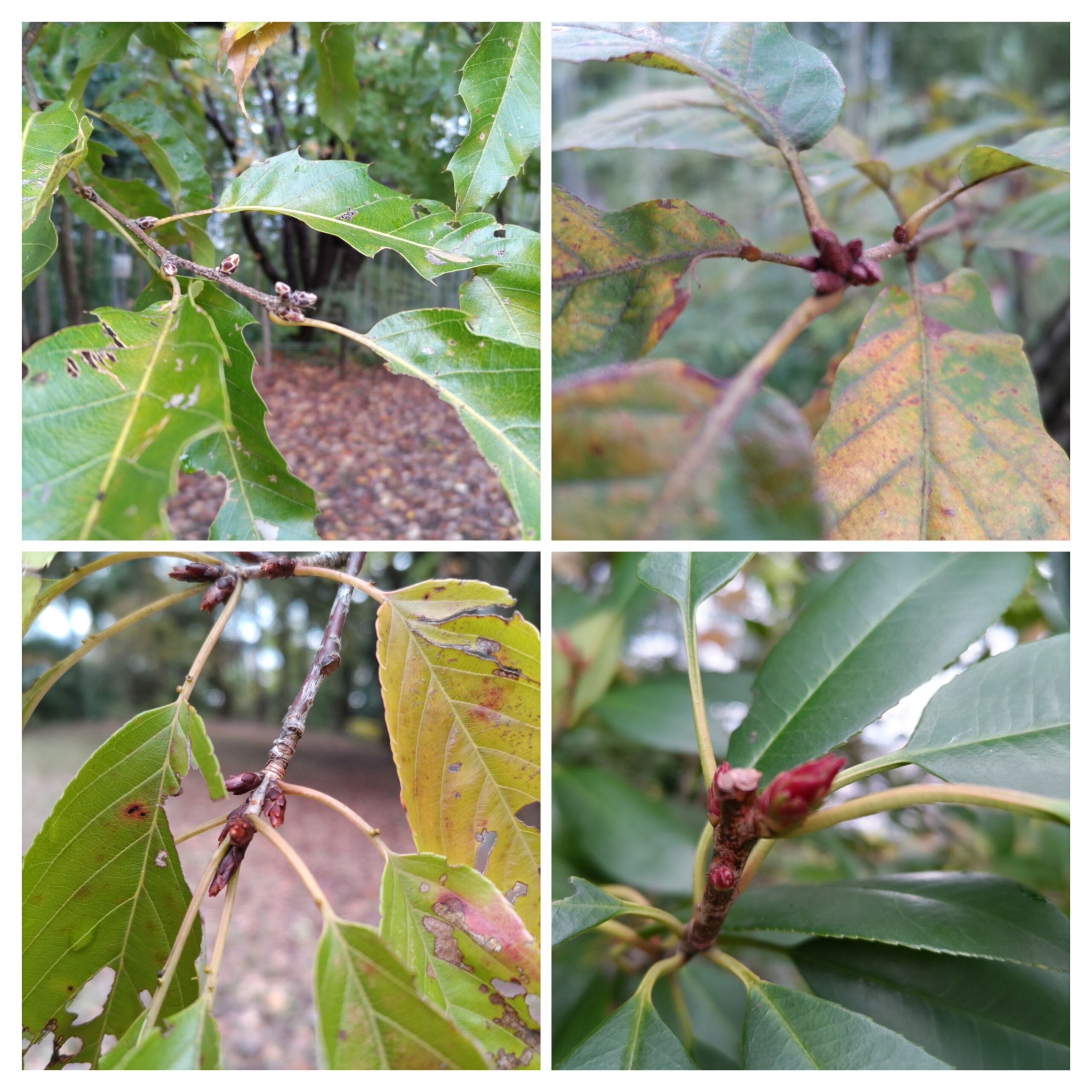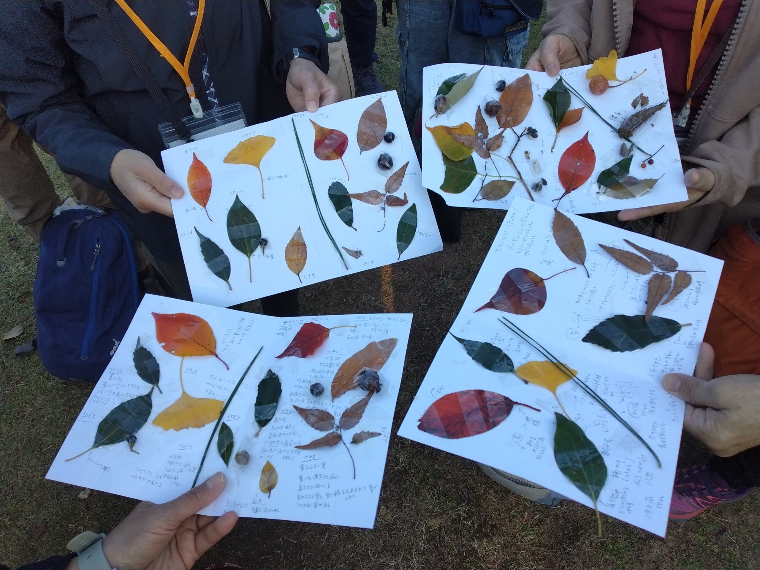 「大阪にあってもコナラです」などと少し脱線気味な紅葉と冬芽の座学を受けた。紅葉には紅葉・黄葉・褐葉と3種あり、いろいろな色素ができたり、葉緑素が分解されたりで違いが生まれる。紅葉の3大要素は①日光②低温③温度差であり、年や場所や枝のついた箇所によって差がある。冬芽には「花芽」と「葉芽」と「混芽」の3種類あり、葉が落ちる冬の時期に目立って枝先にみられると教わった。