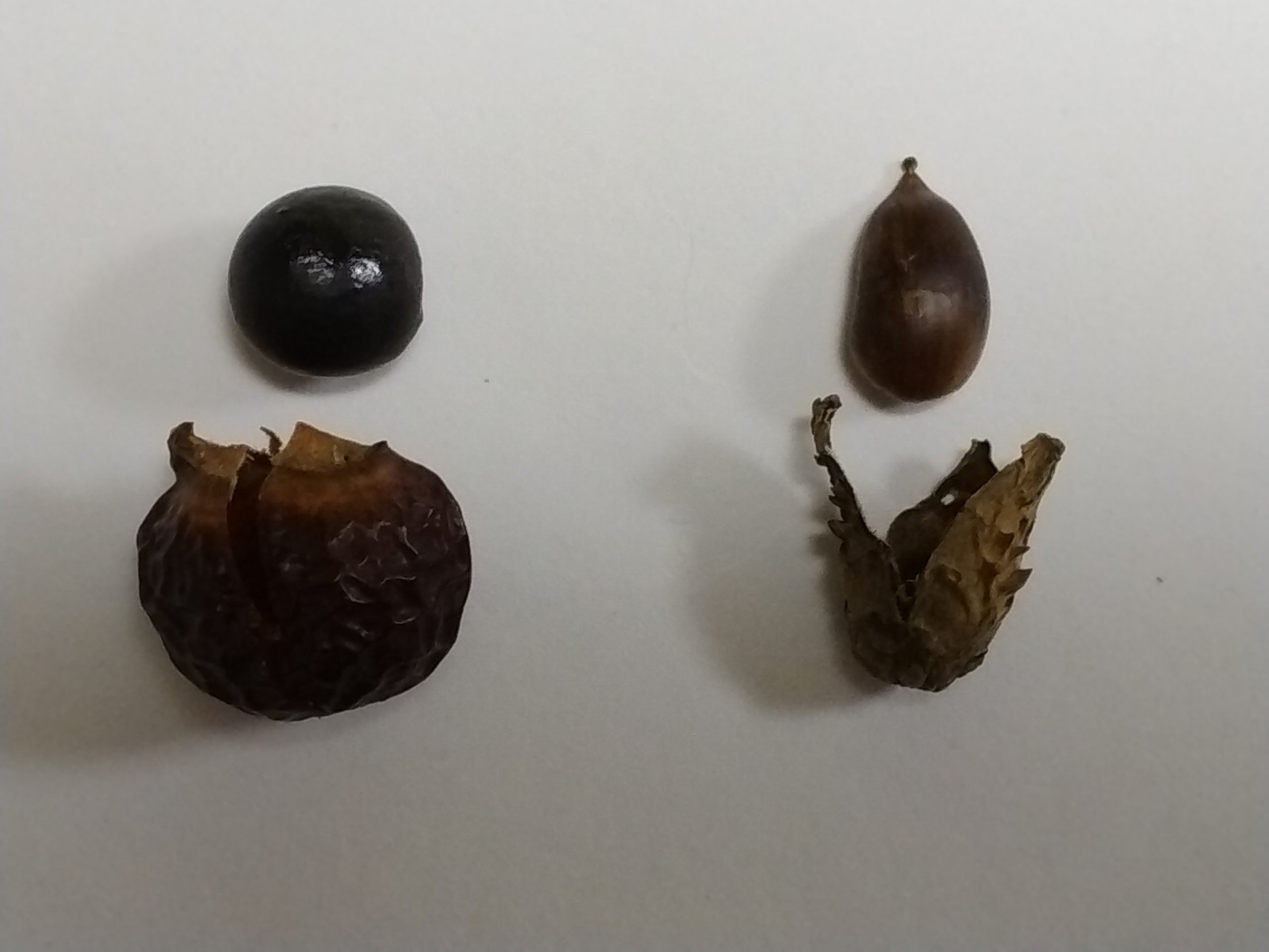 ムクロジの実(左)・シカの大好きなスダジイの実(右)なかなか見つからないのはなぜ?