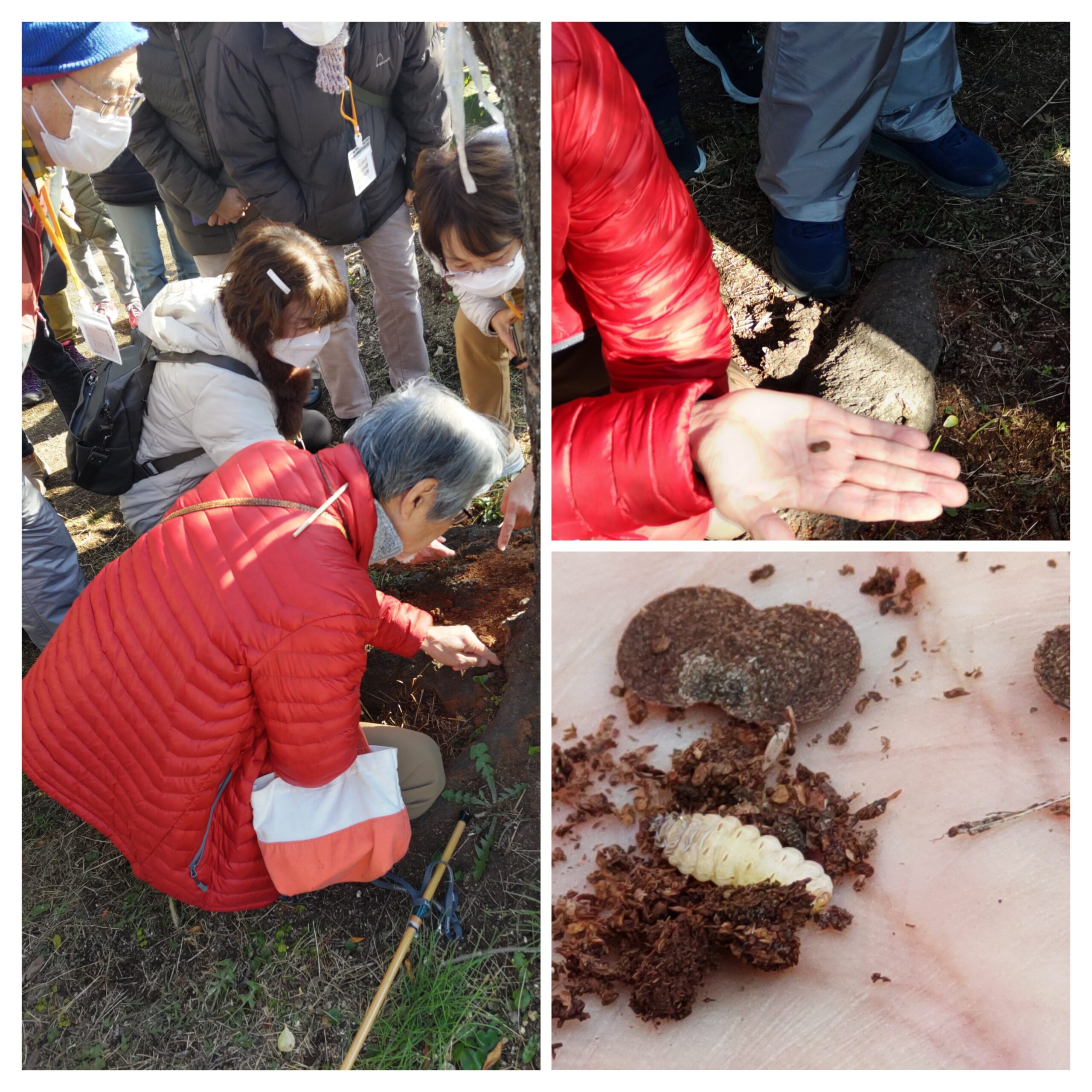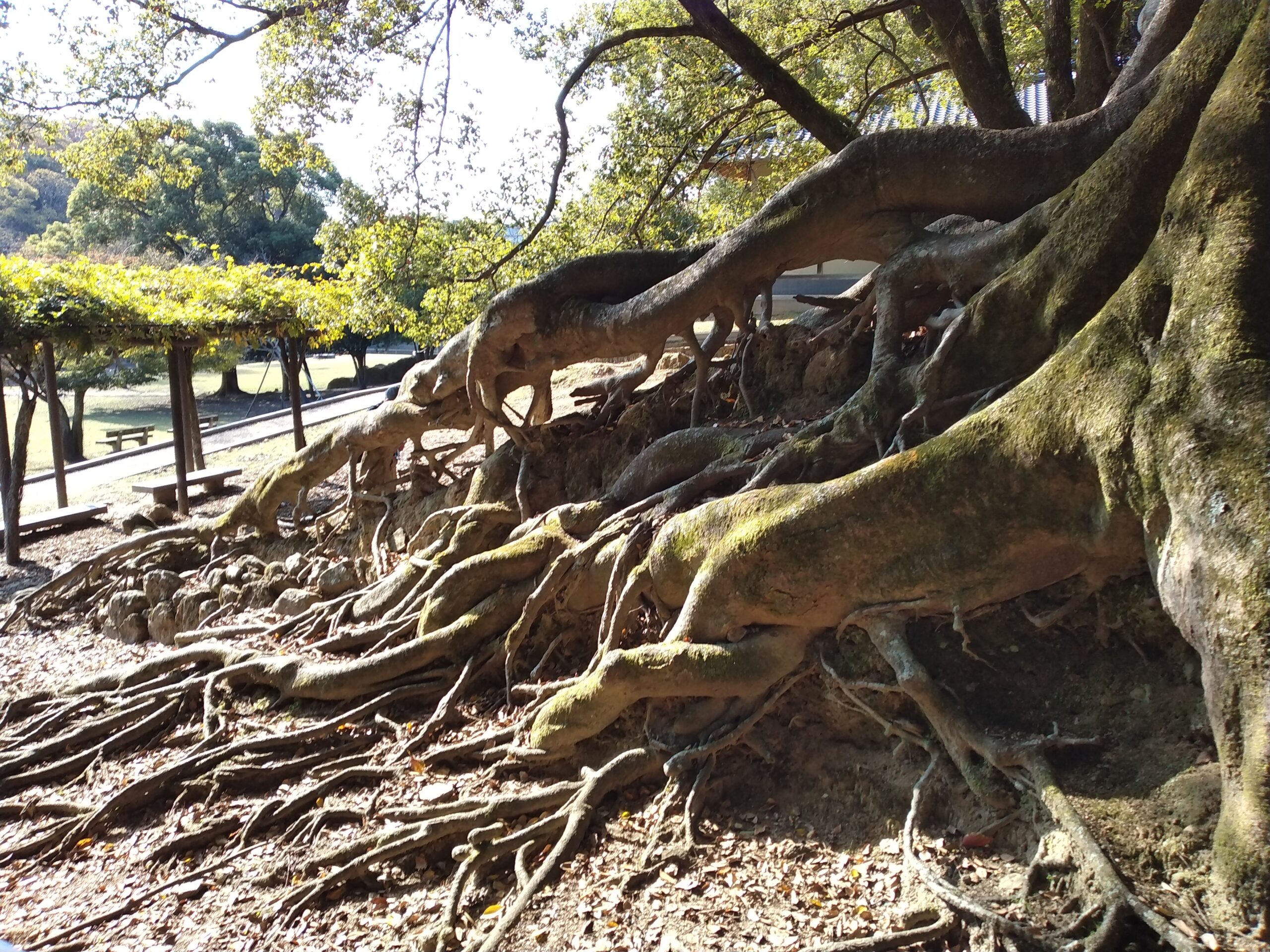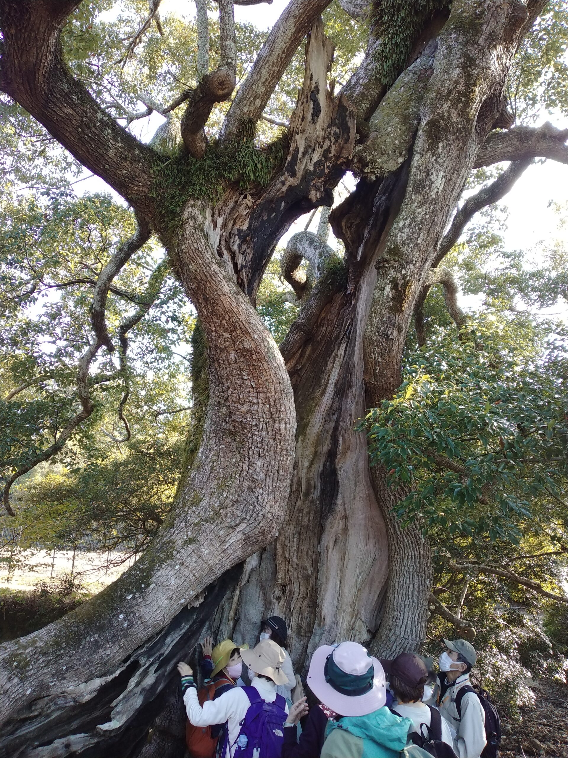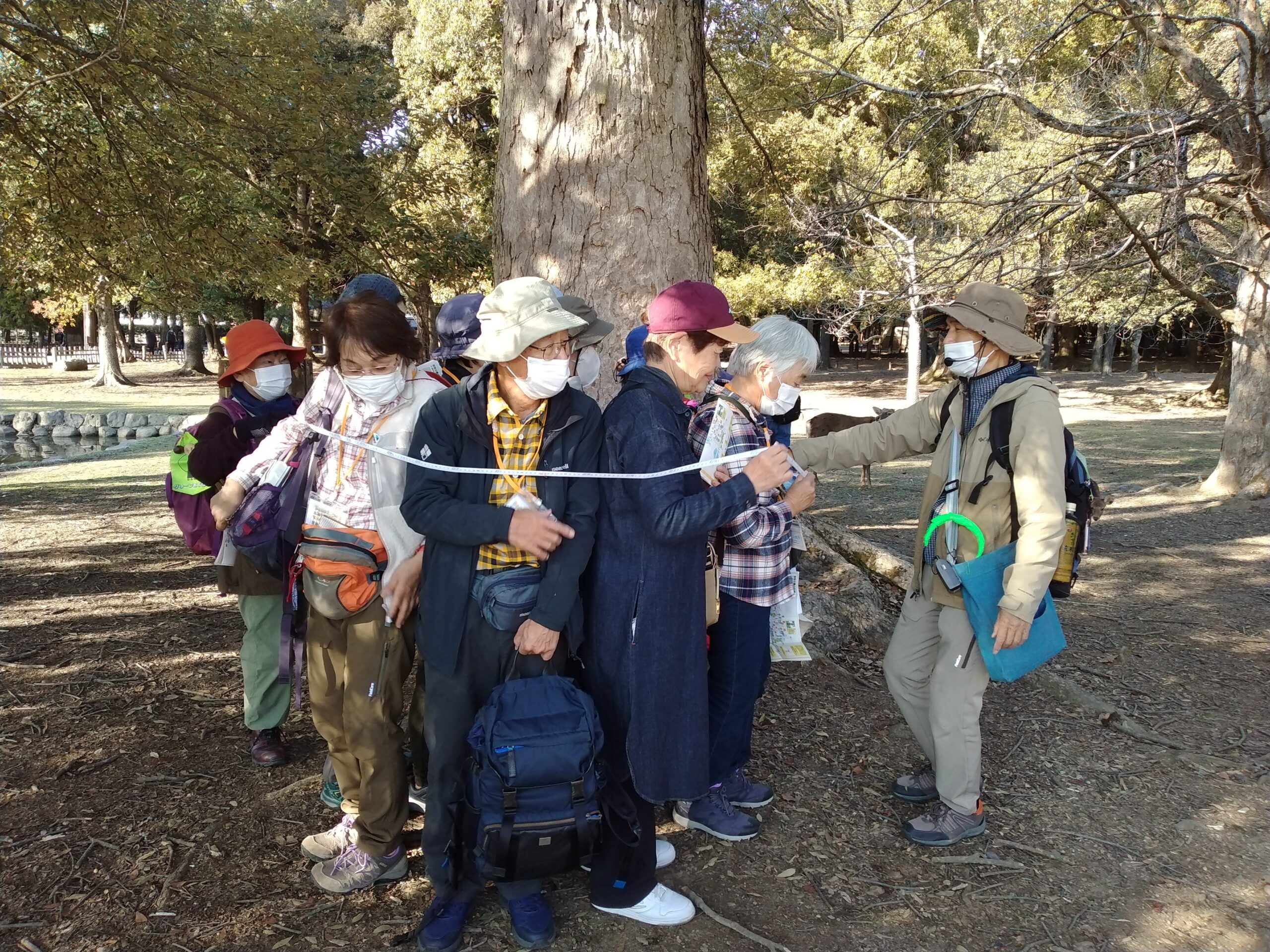 午後からは巨樹観察を中心に移動。エノキ、コブシ、イヌシデの種が風で舞う姿を想像し、飛火野へ。見渡す芝生を移動して、大洞クスノキを観察。八度の落雷で中は空洞で今も黒く煤けた跡が残る。それでもしっかりと樹皮が巻き込み生き続ける巨樹の生命力に感動。クスノキ三兄弟や、ケヤキとクスノキの共生する姿に植物の知恵を知った。