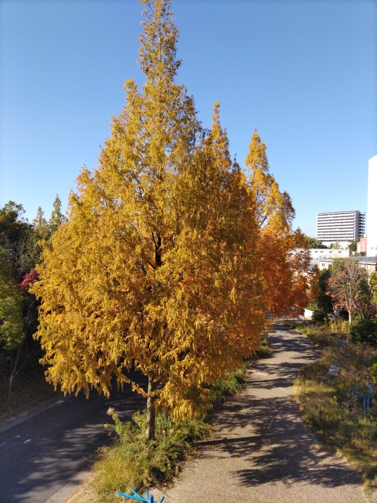 気持ちよい青空にメタセコイヤの黄褐色が映える