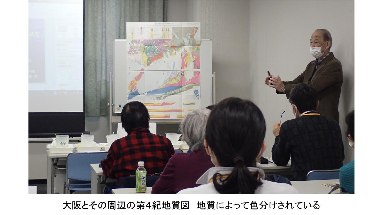 午前は公民館で座学。最初に大阪とその周辺の第4紀地質図を見ながら和泉山脈、生駒山の斑レイ岩、二上山の火山岩、金剛山の花崗岩、上町台地、千里丘陵などの色付された地質の説明を受けた。地質の違いから地形がわかるという。和泉山脈からは貝の化石が出たことから昔海だったことがわかる。