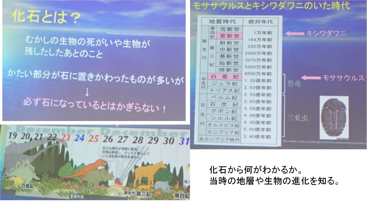 化石から何がわかるか。化石の出た場所を調べることにより当時の地層、年代や生物がどのように進化してきたかを知ることができる。