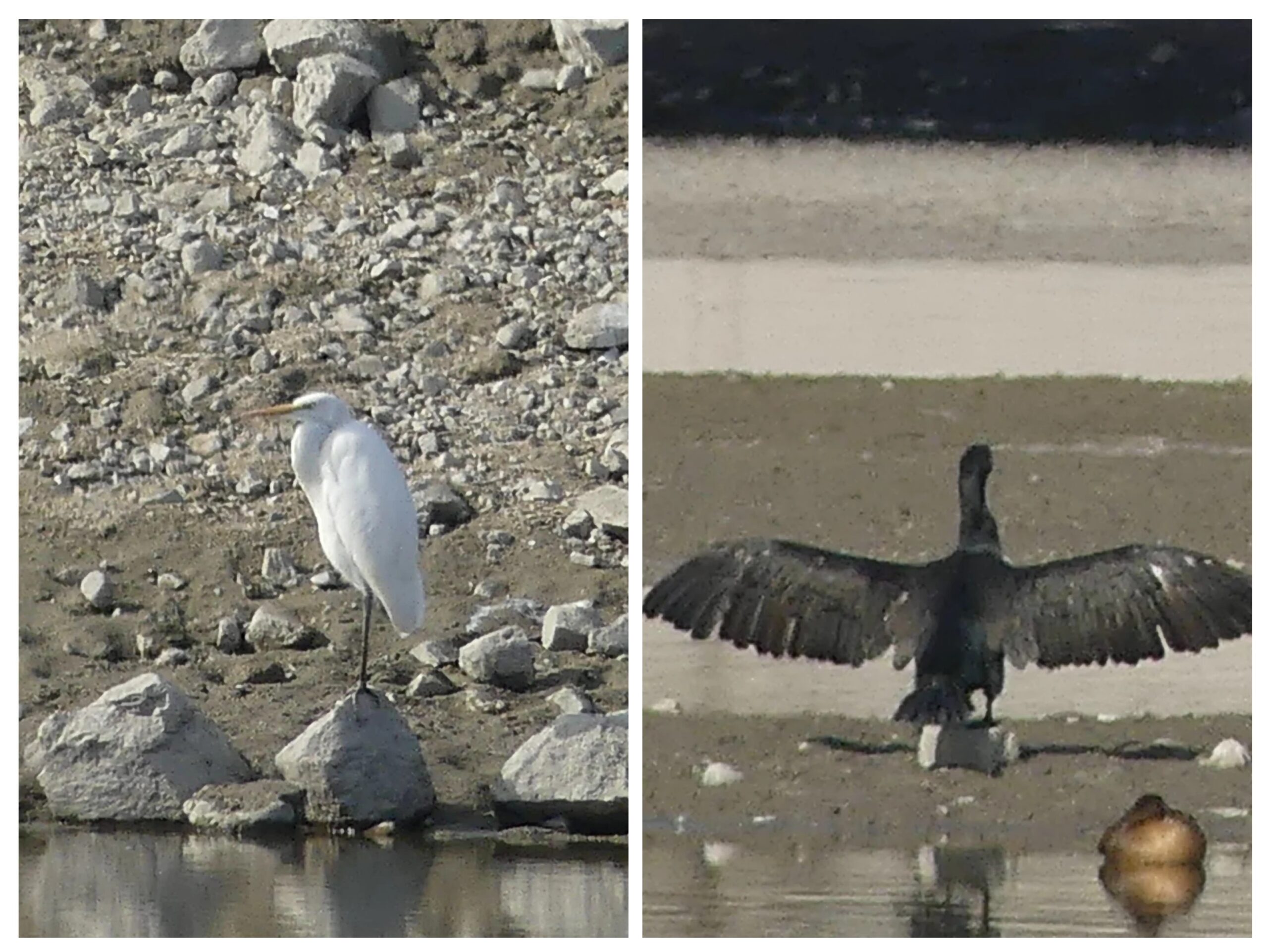 粟ヶ池で白のダイサギ、黒のカワウ。なかなかの立ち姿。