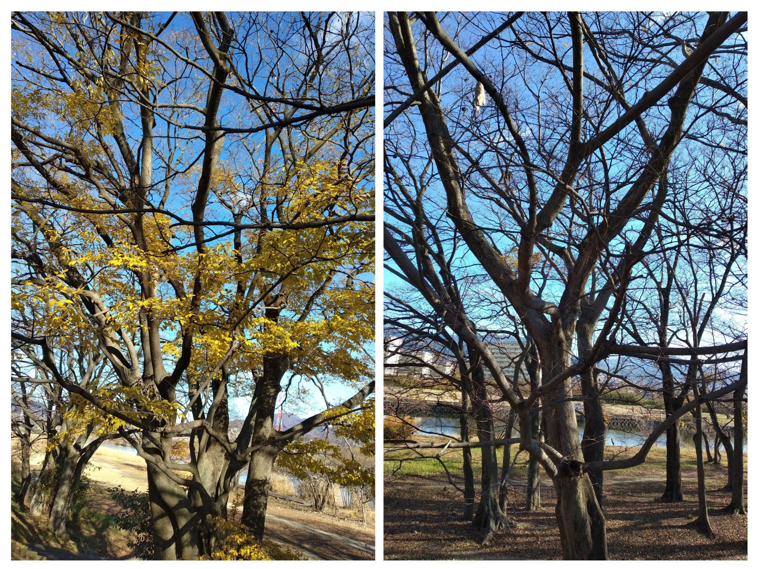 午後は晴天のなか、歩き出してすぐヤマモモにからみついたクズの除き方(根元をきる)。続いてマンション前のシマトネリコは奇数回羽状複葉で種のつき方も造りも同様だと確認した。10分ほど歩いた歩道橋の上から見事な黄色に色づいたメタセコイヤに見とれながらその話を聞き、クヌギとクリの葉の違い、シラカシとアラカシの違いなどについてなど次々と話は続く。公園にいつたどり着くのか心配になってきた。