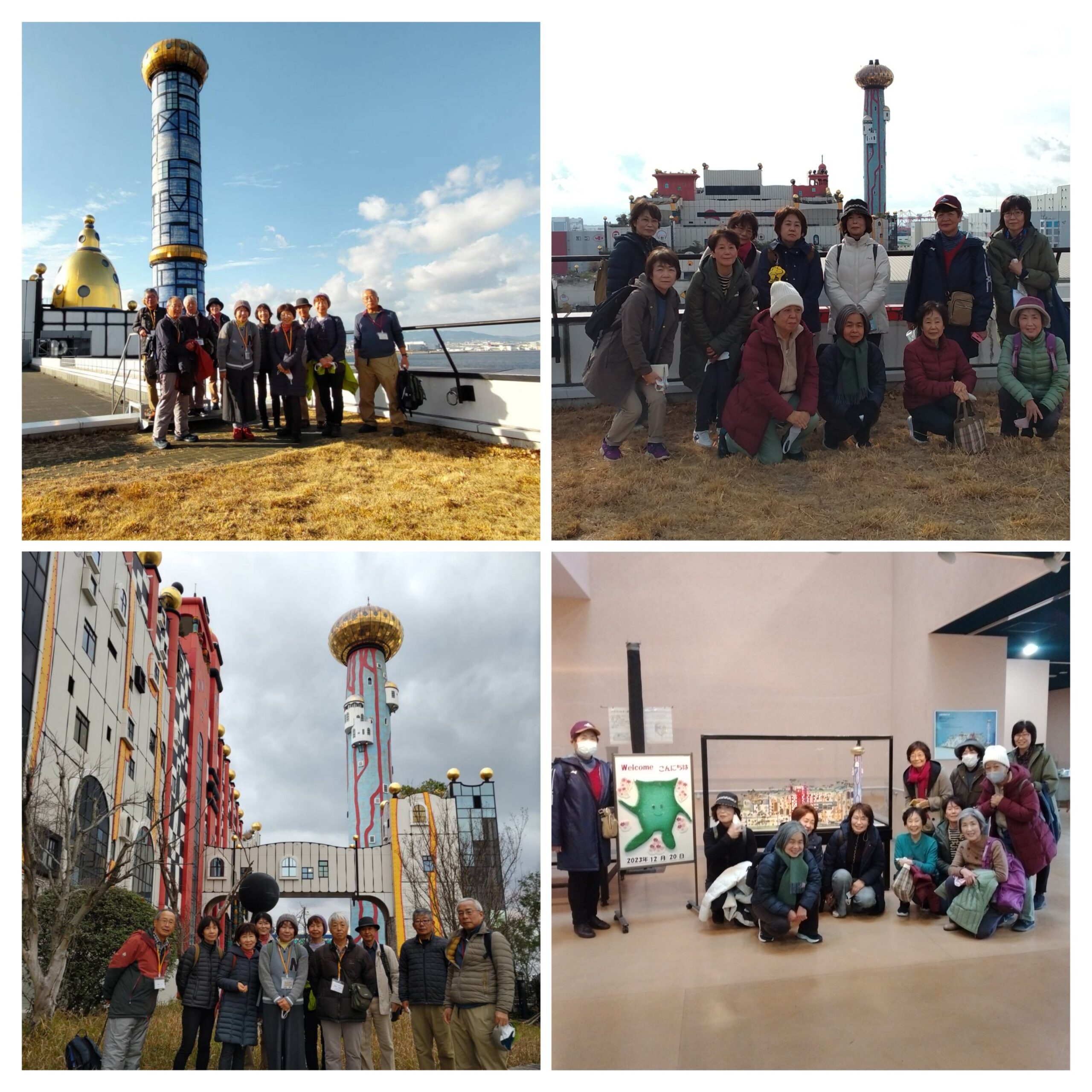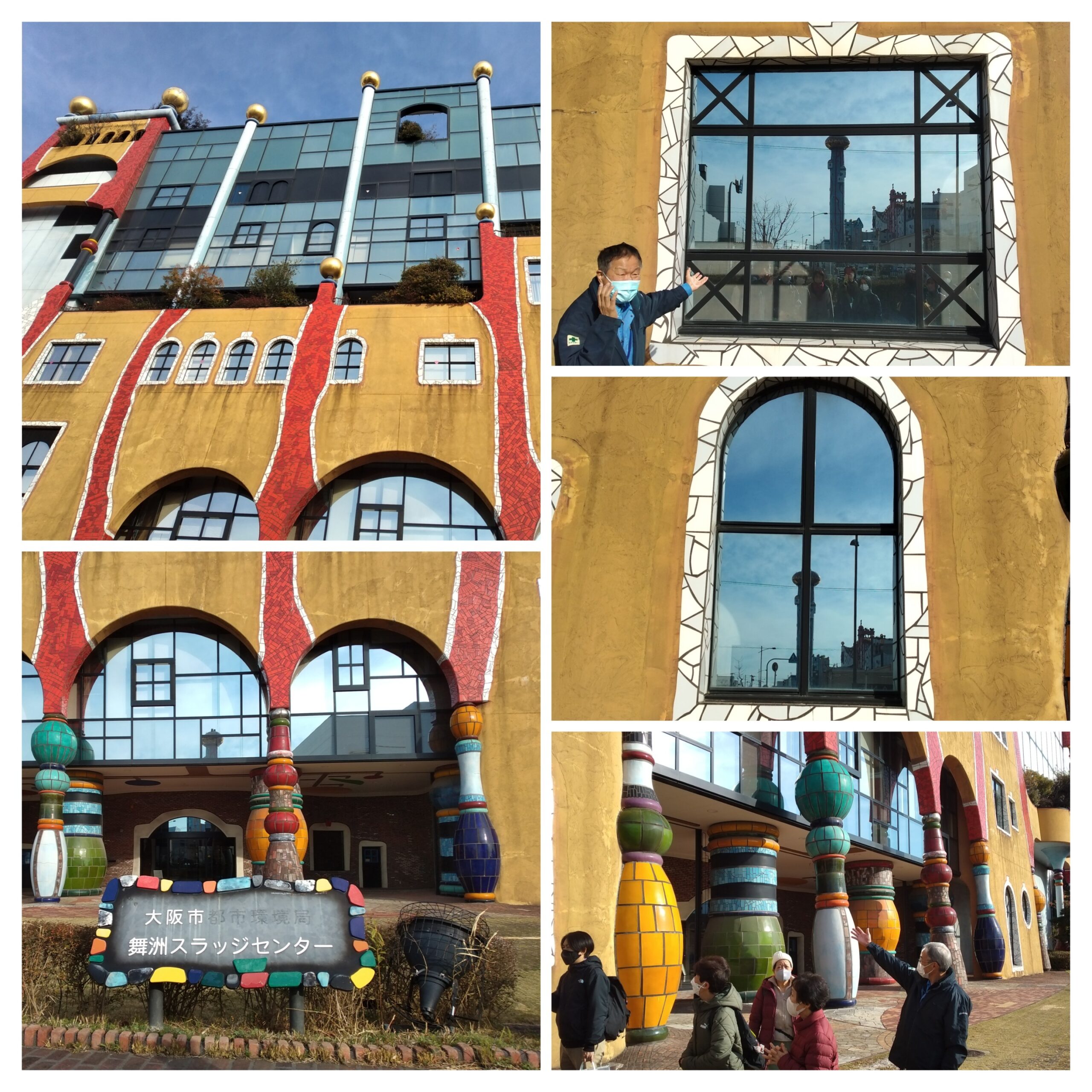 誰もが一度は「あれ、何?」と不思議に思ったのではないだろうか。湾岸線から見えるカラフルでユニークな建物。今回はその舞洲スラッジセンター(下水汚泥処理施設)と舞洲工場(ゴミ焼却施設)を見学した。どちらもオーストリアの芸術家フリーデンスライヒ・フンデルトヴァッサー氏デザインによるもので、日本ではキッズプラザ大阪や赤坂の21世紀カウントダウン時計のデザインも手掛けたとか。自然との調和を意識して曲線を多用し、緑に囲まれた唯一無二のユニークなデザインである。その建物の中で、私たちの日々の生活に大きくかかわる下水汚泥処理とゴミ焼却が、最新の技術でより安全に自然環境を配慮して効率的に行われている。さらにエネルギーを生み出し、有効利用できる資材を作るなど考えられているとか。どちらの施設も担当者の方が親切に、また楽しく飽きることなく案内してくださった。