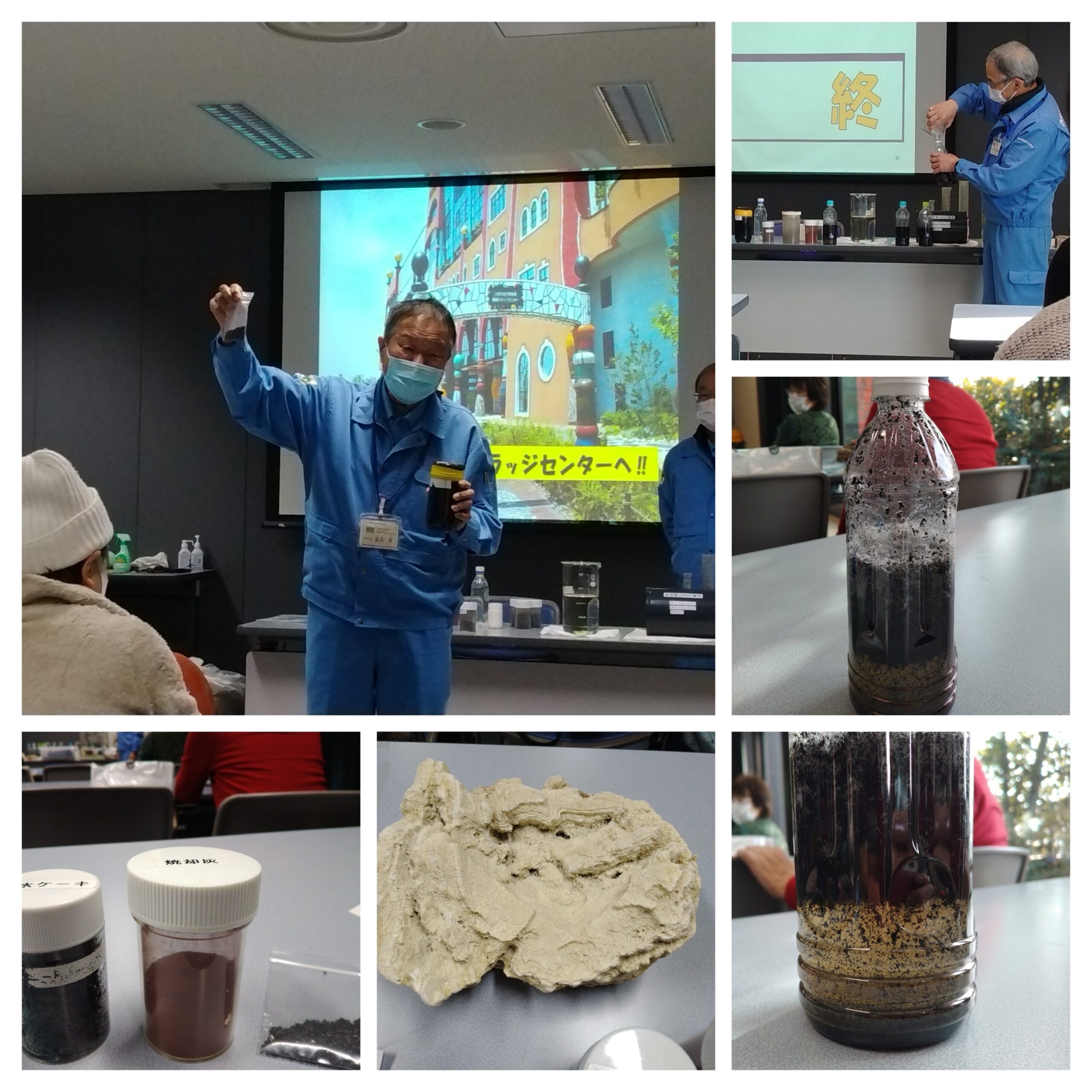 汚泥と水に溶かしたポリマーを混ぜて振ると、汚泥ケーキと水に分離。その他、汚泥ケーキ・焼却灰・溶融スラグ(袋の中、建設資材として活用)・汚泥圧送管の中にたまった塊(取り除く作業が大変、動脈硬化か)