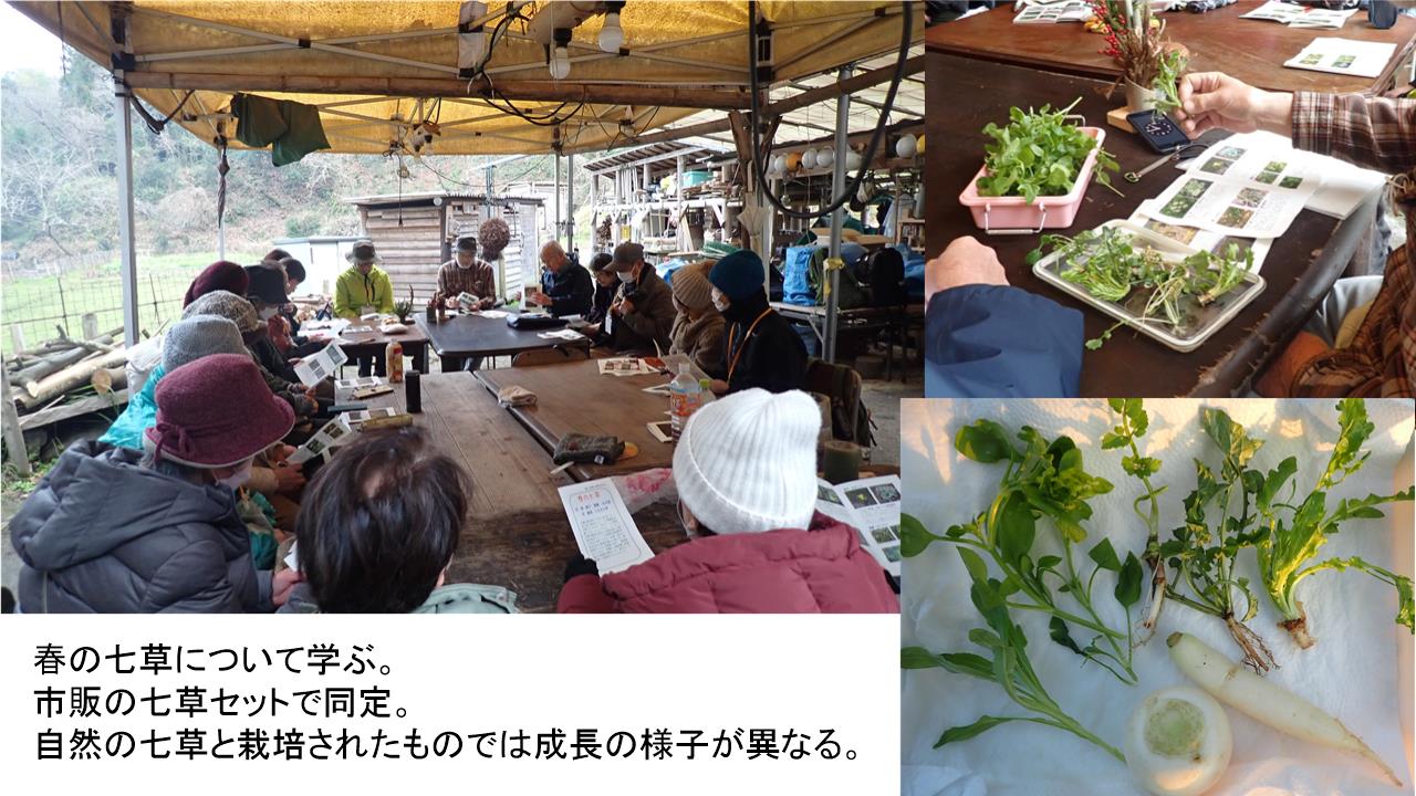 最初に大阪シニア自然カレッジ代表から年頭の挨拶があり講座がスタートした。春の七草、芹(せり)、薺(なずな)、御行(おぎょう、ハハコグサ)、繁縷(はこべら)、仏の座(ほとけのざ、コオニタビラコ)、菘(すずな、カブ)、蘿蔔(すずしろ、ダイコン)について写真を見ながら説明を受けた後、市販の「春の七草セット」で栽培された七草を観察した。(七草すべてを野外で見られないので参考に。)