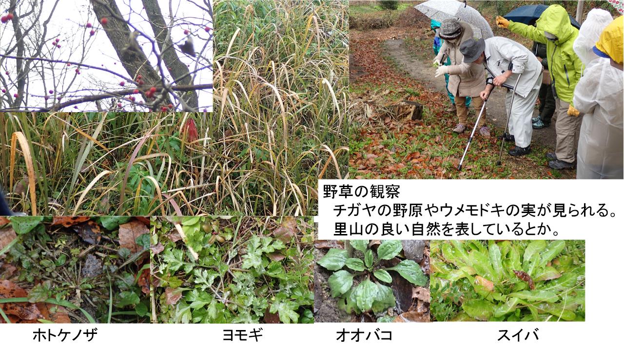 雨の中ではあったが寒い冬の時期ならではの野草のロゼットや枯れたチガヤの草むらなど、里山管理された自然の中で懐かしさを感じる散策ができた。