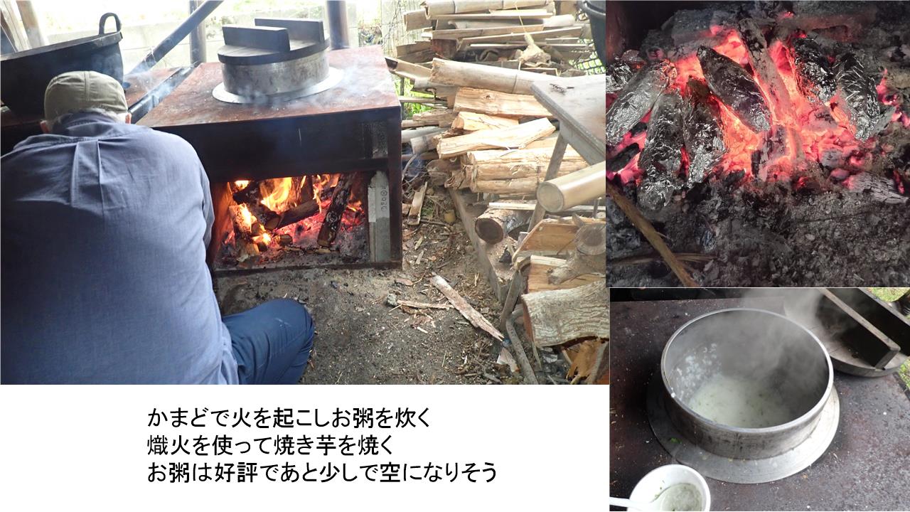 里山観察から戻ると、七草粥は見事に炊きあがり焼き芋も立派に焼けてかまどの中に並んでいた。