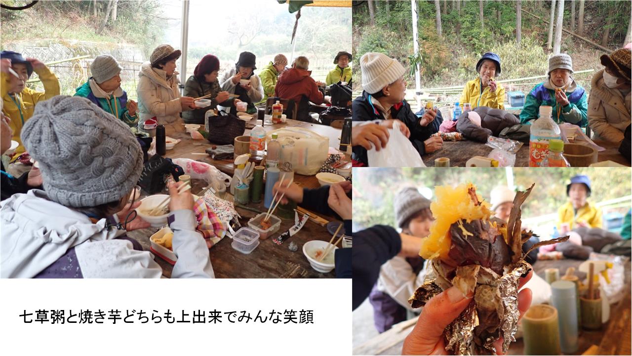 熱々の七草粥を何度もおかわりし、お漬物や梅干しなど分け合ってお釜の中はすっかり空になった。焼き芋もほっくり甘く焼き上がりみんな笑顔で和気あいあいのお昼を楽しんだ。
