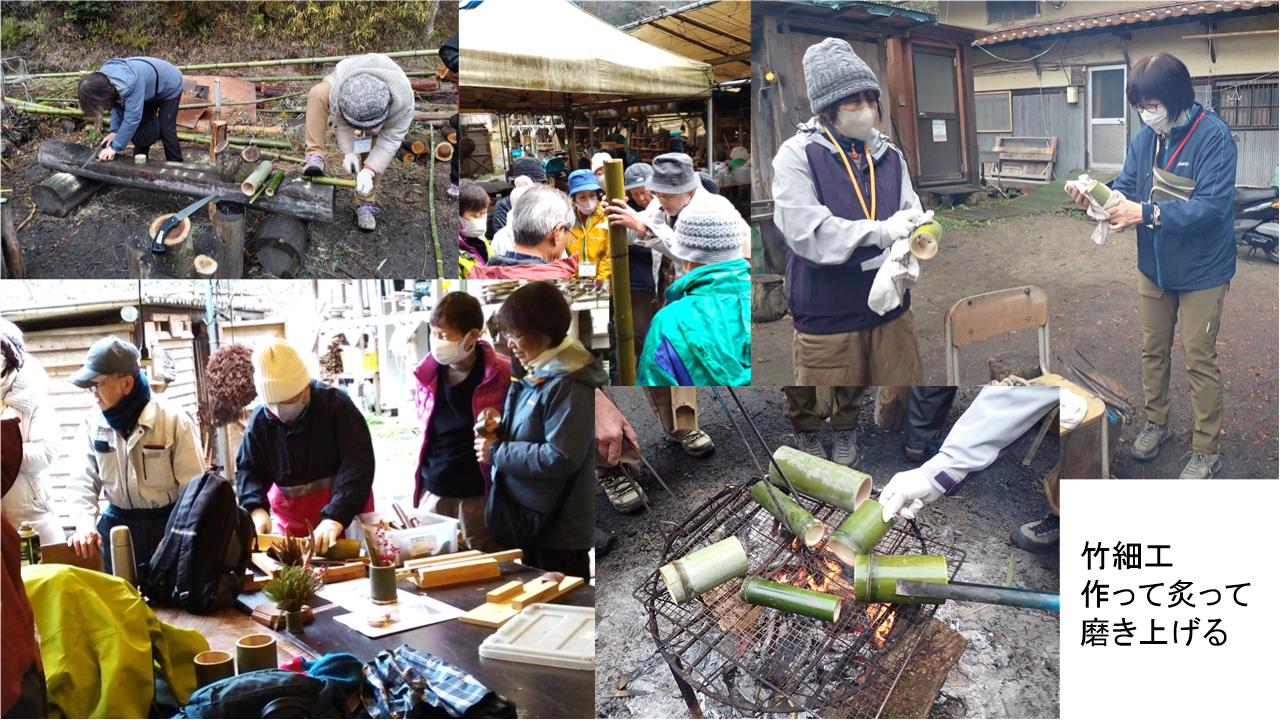 最後は、竹細工。竹の種類や竹を切る道具の説明を受けて思い思いに花入れやペン立て、カップを作り焚き火で熱を加えては布で磨いて作品を作り上げることができた。(E.H)
