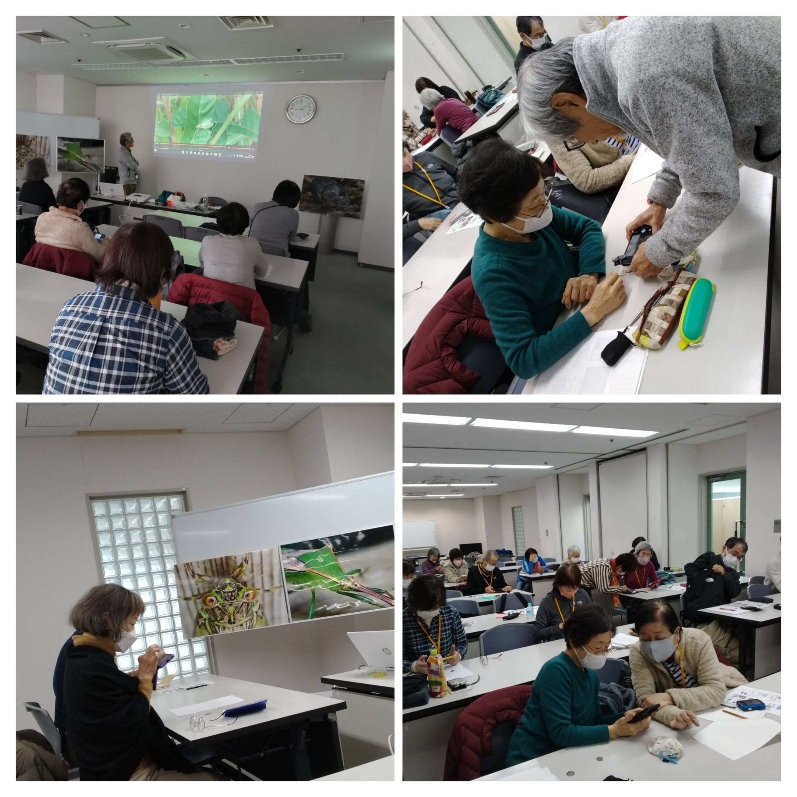 フィールドワークなどで自然を楽しむためのマクロ写真撮影入門講座。岩湧山の岩湧寺を中心に昆虫を中心とした写真や動画を撮影されてきた講師にデジタルカメラの知識や撮影時の工夫や注意点を学んだ。