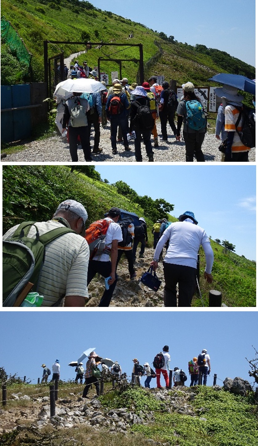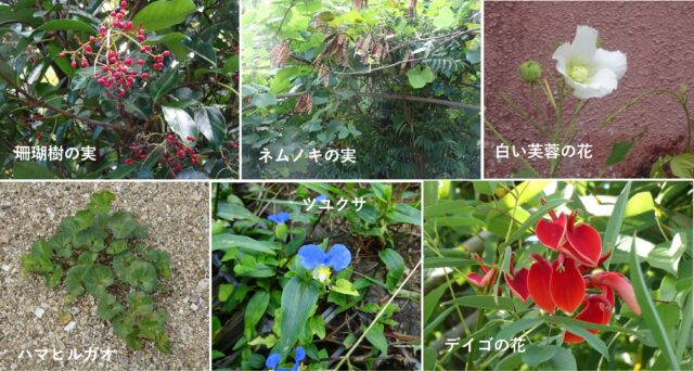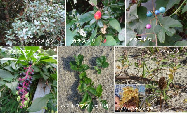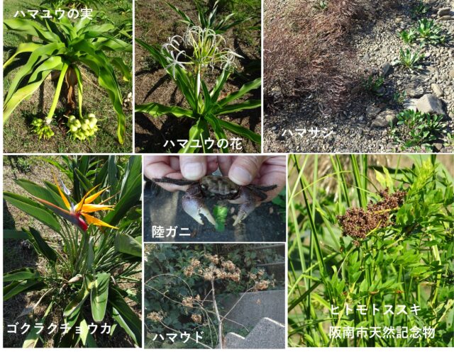 崖地では、ウバメカシが圧倒的に多く、その他にヒメユズリハ、クサギなどの木が断崖に張り付くように成長していました。砂浜・礫質海岸ではハマヒルガオ、ハマボウフウ、ハマゴウ、ハマサジ(特に塩水耐性が高い)などが見られましたが、当初予定していた6月であれば開花していた植物は多かったとのことでした。アメリカネナシカズラという植物はハマゴウに寄生している根を持たない植物とのことで、変わった植物も身近にいることを知りました。また、オカヒジキ、ハマダイコン、ハマボウフウなどは食べられるとのことでした。どんぐりの中にもスダジイのように生でも食べられるものがあり、試食したりしました。変わった形のハマユウの花と実、ゴクラクチョウカの花、そして沖縄の歌でよく聞くデイゴの花も見られました。足の速い陸ガニを見つけバトルの末捕まえて、最後には阪南市の天然記念物であるヒトモトススキを見て箱作駅に向かいました。朝からたくさん歩き、汗ばんでいましたが珍しい植物を楽しみ、浜辺の植物が一段と身近になりました。(Y.M)