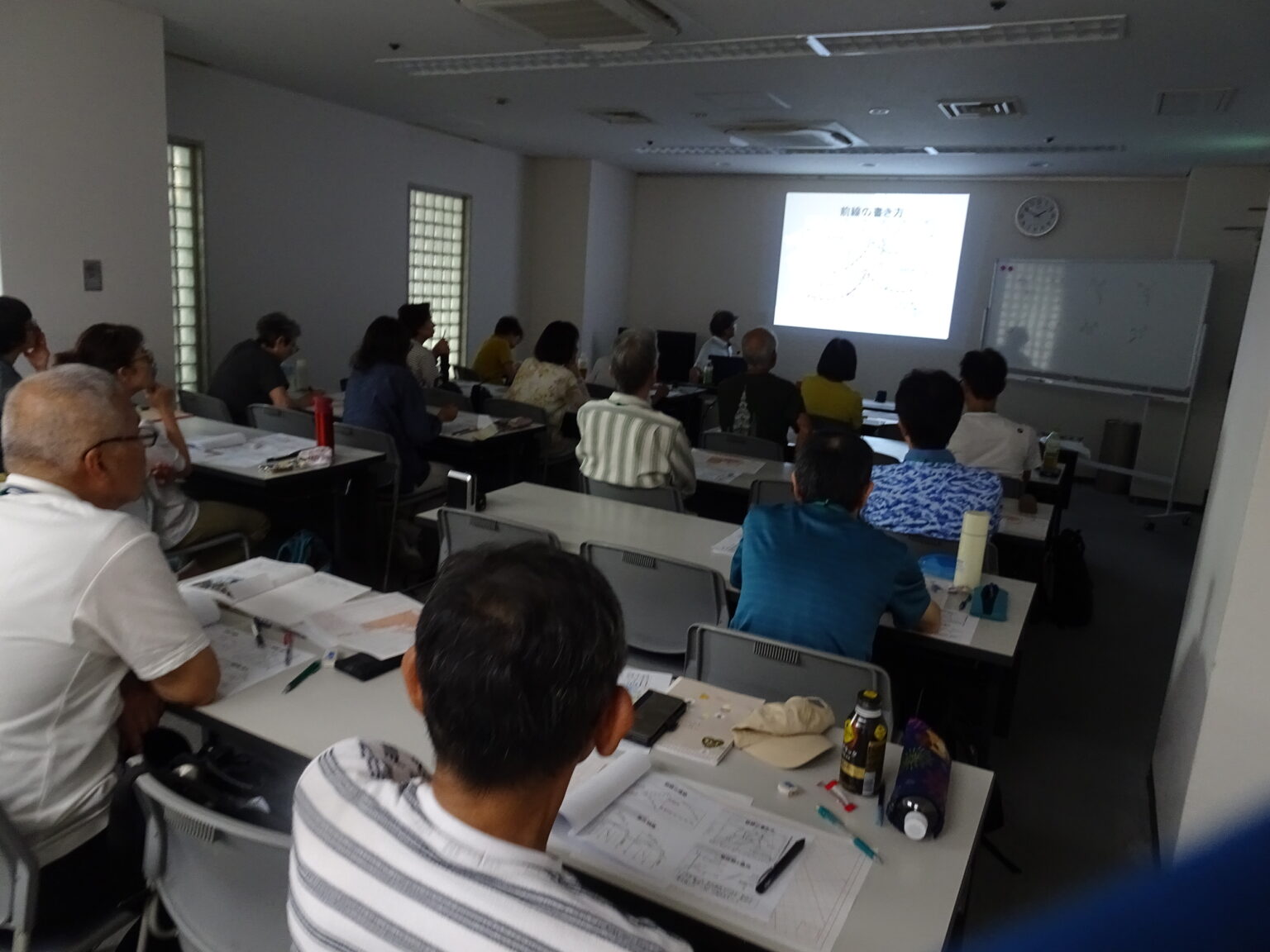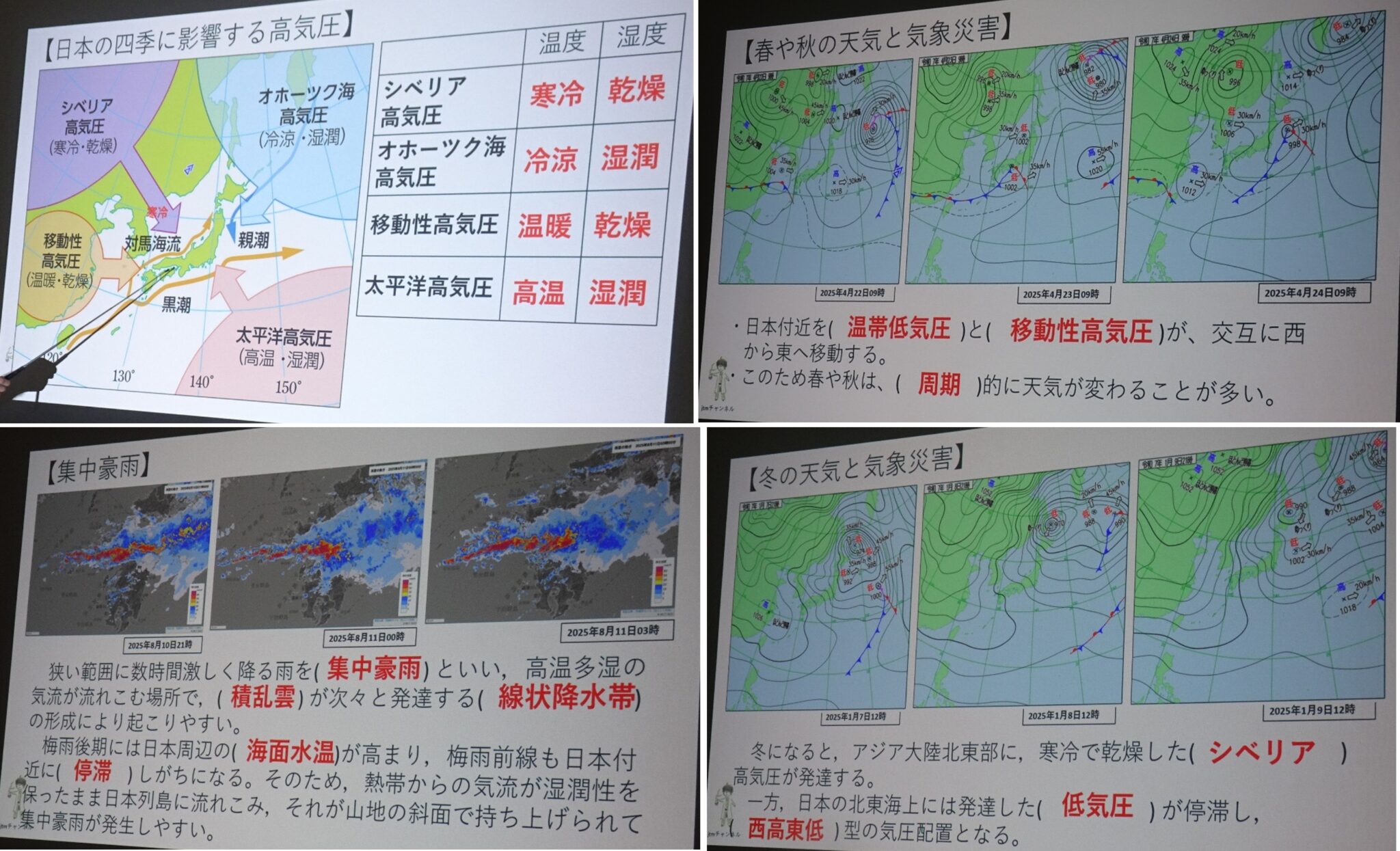 今日は、暑い夏や大雨を降らしたりする気象の基礎についてです。日本の四季、集中豪雨や台風ができる仕組みから、天気図の書き方まで学びました。
