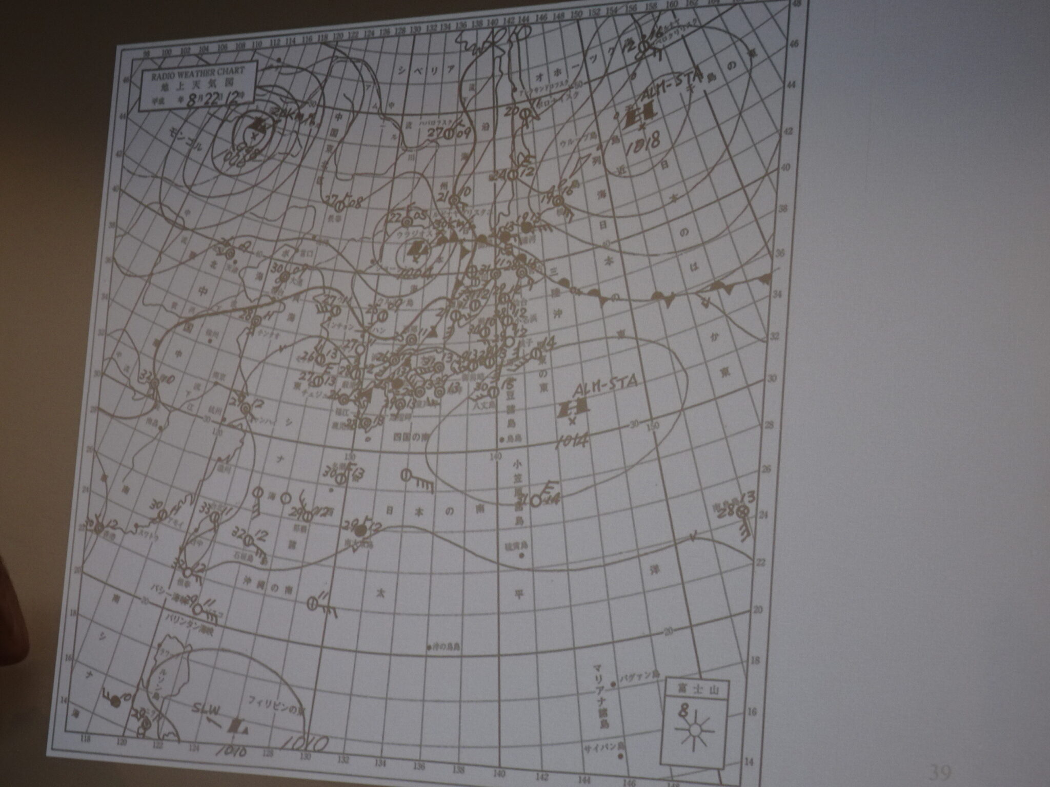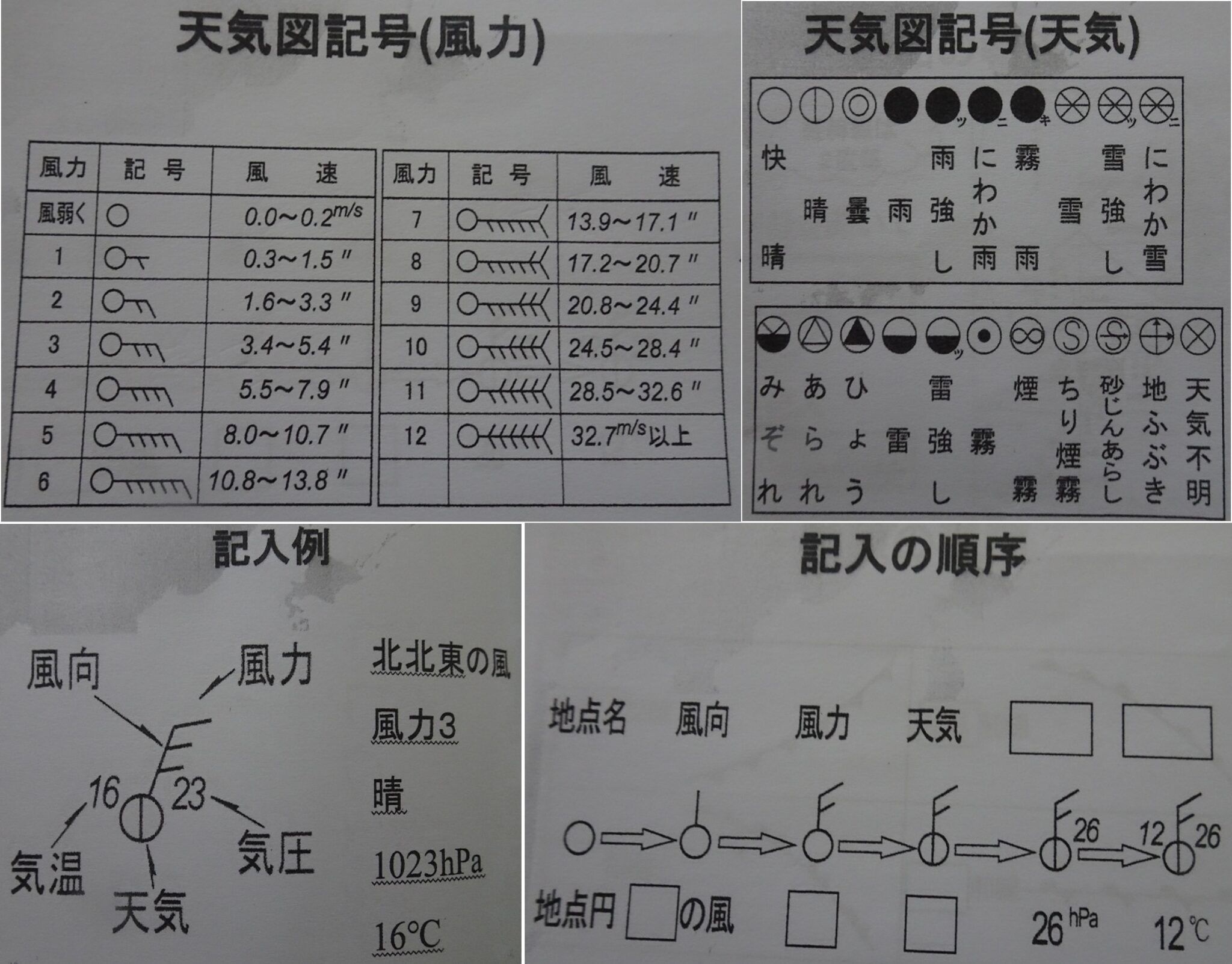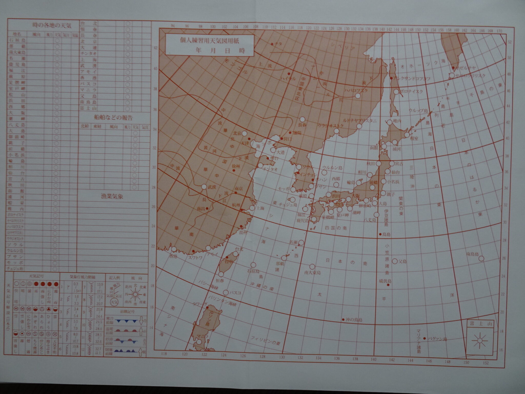 午後からは天気図の活用につながる、天気図の作成に挑戦です。現在は1日1回、16時にNHK第2放送から日本付近の気象情報が放送されており,それを聞きながら天気図を作成してみました。風向き、風力、天気、気圧、気温の情報が各都市や船舶などから報告され放送されています。前線や等圧線の書き方トレーニング後に本番でしたが、放送の内容が早く、なかなか追いつけません。みんな集中し必死について行きましたが、諦めた人もチラホラ。しかし、実際の起こっている天気は、気圧と温度に起因する雲や風の発生等、それぞれの理屈に基づいて起こっていることが理解できました。最近、ひどい天気が続いているので、これからはもう少し天気図を真面目に見るようにしましょうか。(M.Y)