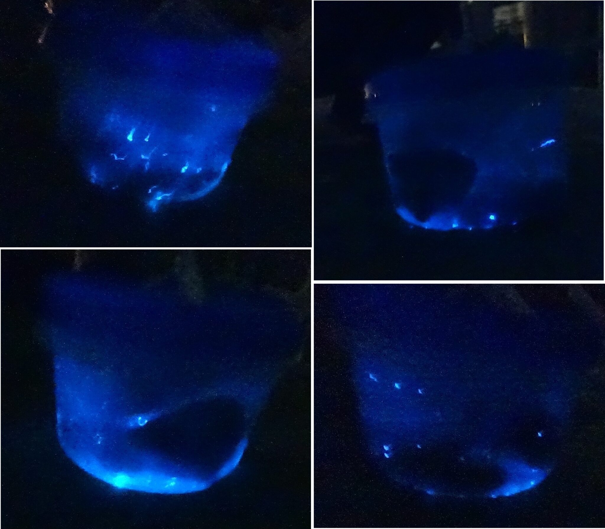 18:30頃には、海辺も薄暗くなって、足元を懐中電灯で照らしながら突堤へ。餌をたっぷり入れた手作りの仕掛けを海の底に投入。20分間星空を見て待つ予定でしたが、残念ながら星が見られなく、おしゃべりを楽しんで待つことに。アッという間に時間になり、仕掛けを上げると容器の中には青紫の光が?振動を与えると、数秒の光が見えてかなりきれいであちこちで歓声が沸き上がっていました。飼育できるのならば持ち帰りたいほどでしたが、最後は餌とともに海に帰してあげました。いつもと違う夜の講座は、ウミホタルの発光に魅せられて、非常に楽しく素晴らしいものでした。(M.Y)
