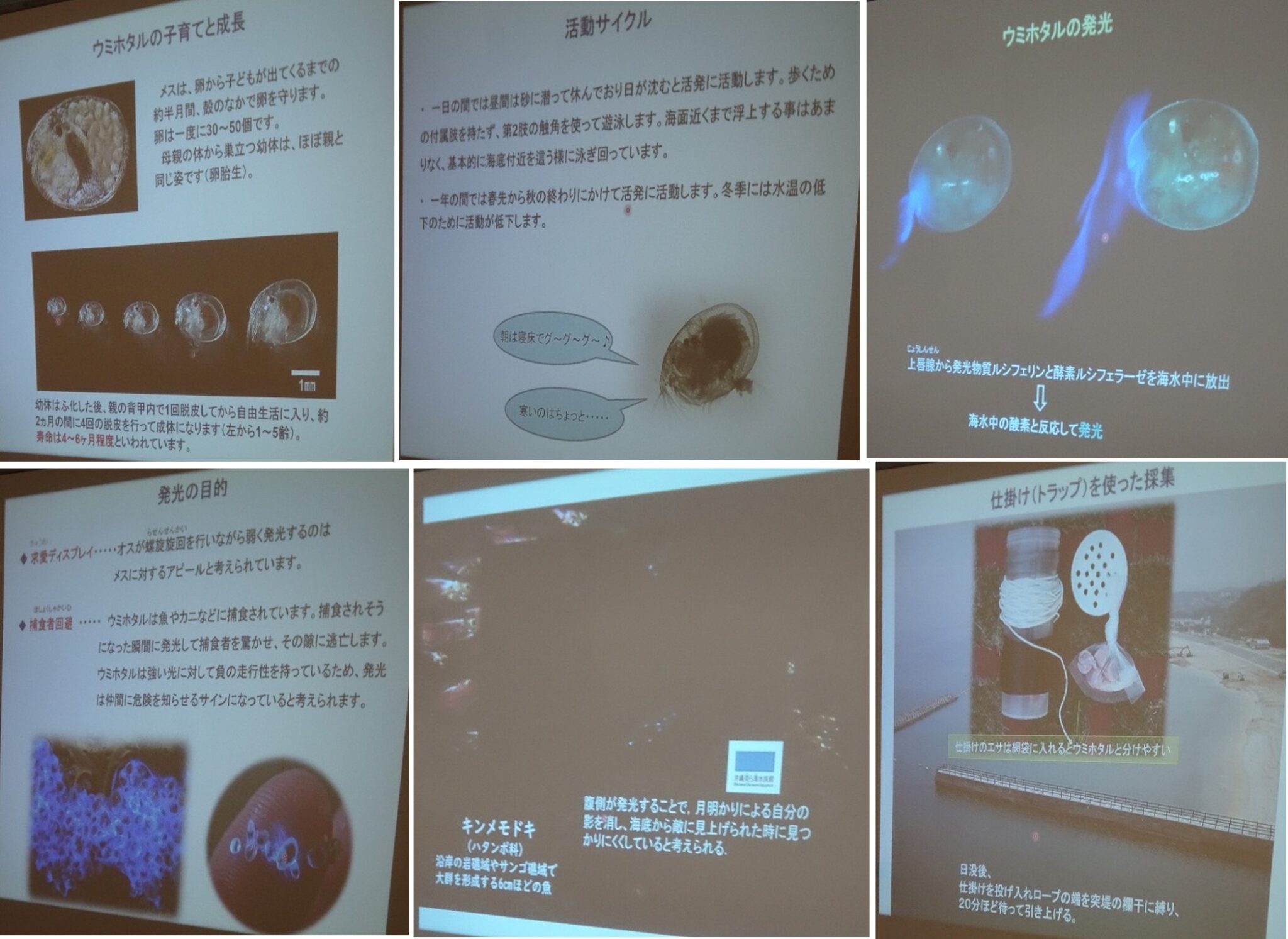 まずは、ウミホタルとは何か?ということで講義を受けました。ウミホタルは直径2~3mmのミジンコのような動物プランクトンでキチン質の殻2枚に覆われた甲殻類だそうです。7対の付属肢があり、触覚・浮遊(泳ぎ?)・餌を食べる・清掃などの役割をもっていて、今回顕微鏡では見なかったのでわかりませんが、体は透けて、卵や消化器官が見えるとのこと。発光の仕組みは上唇腺に蓄えられているルシフェリンとルシフェラーゼ酵素を放出し発光するようです。昼は砂の中でお休みして、夜に餌を探して活動する夜行性で私たちの夕食後、各自ちくわ、魚肉ソーセージ、ちりめんじゃこを穴の開いた容器にブレンドして仕掛けを準備しました。