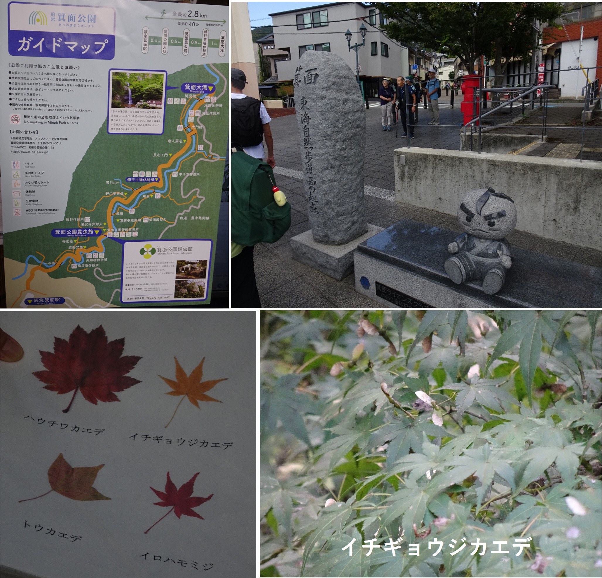 今日は阪急で箕面へ行き、大滝まで公園の自然観察と昆虫館に行きます。お猿さんがいっぱい居た時代以来かな?片道2.4km頑張ります。駅周辺にはマップや滝の道ゆずる君の像、モミジの天ぷらや箕面ビールの旗があり、観光地感がいっぱいです。暑さの峠も超えたこの季節、川沿いの散策は気持ちの良いところでした。