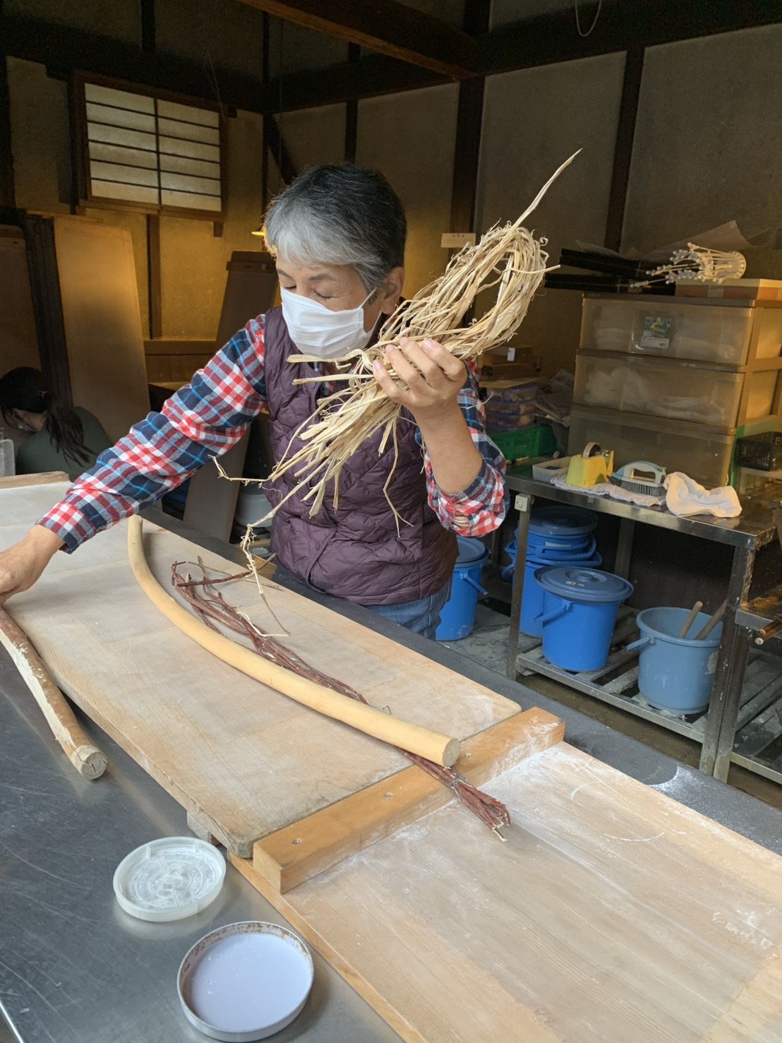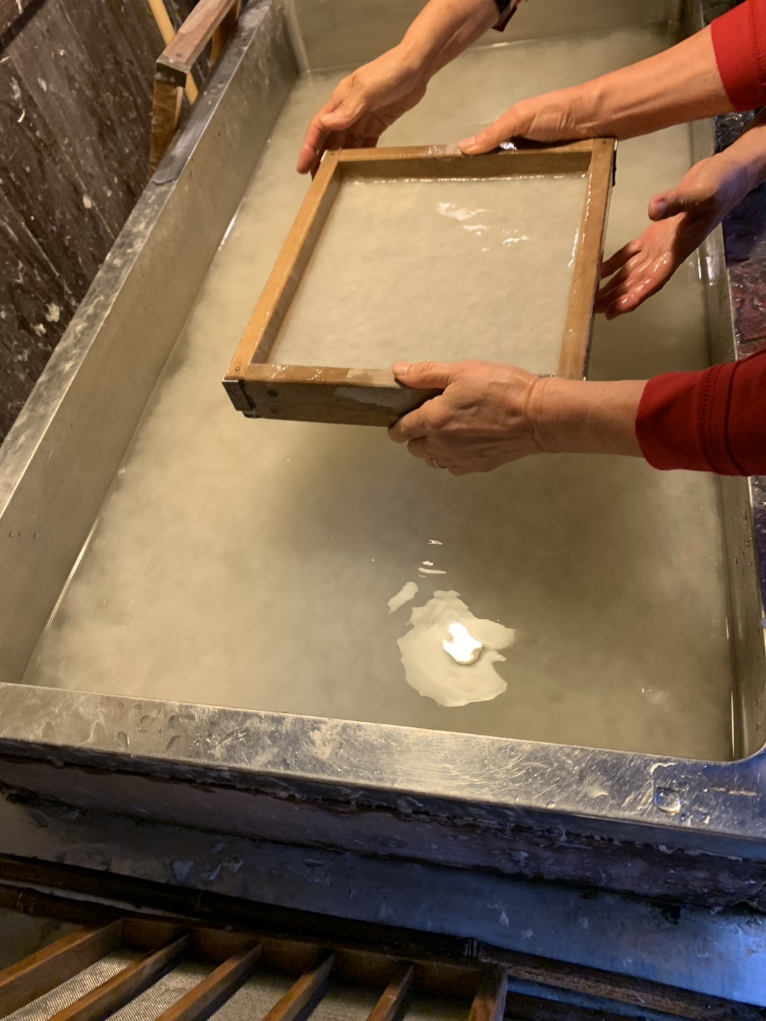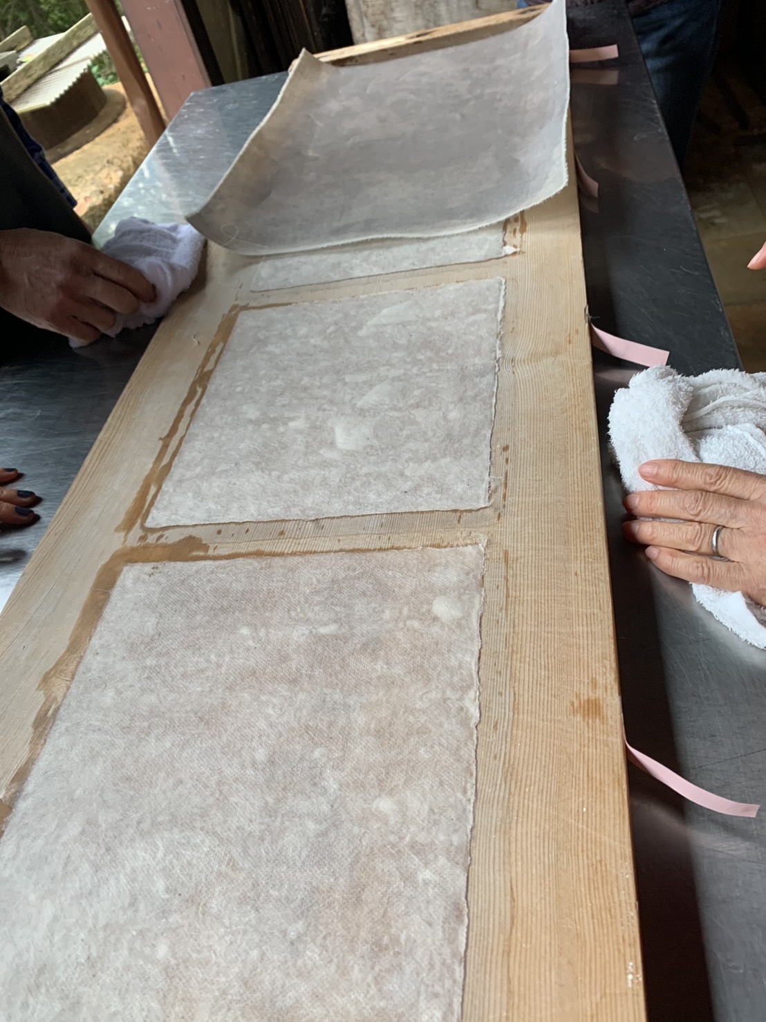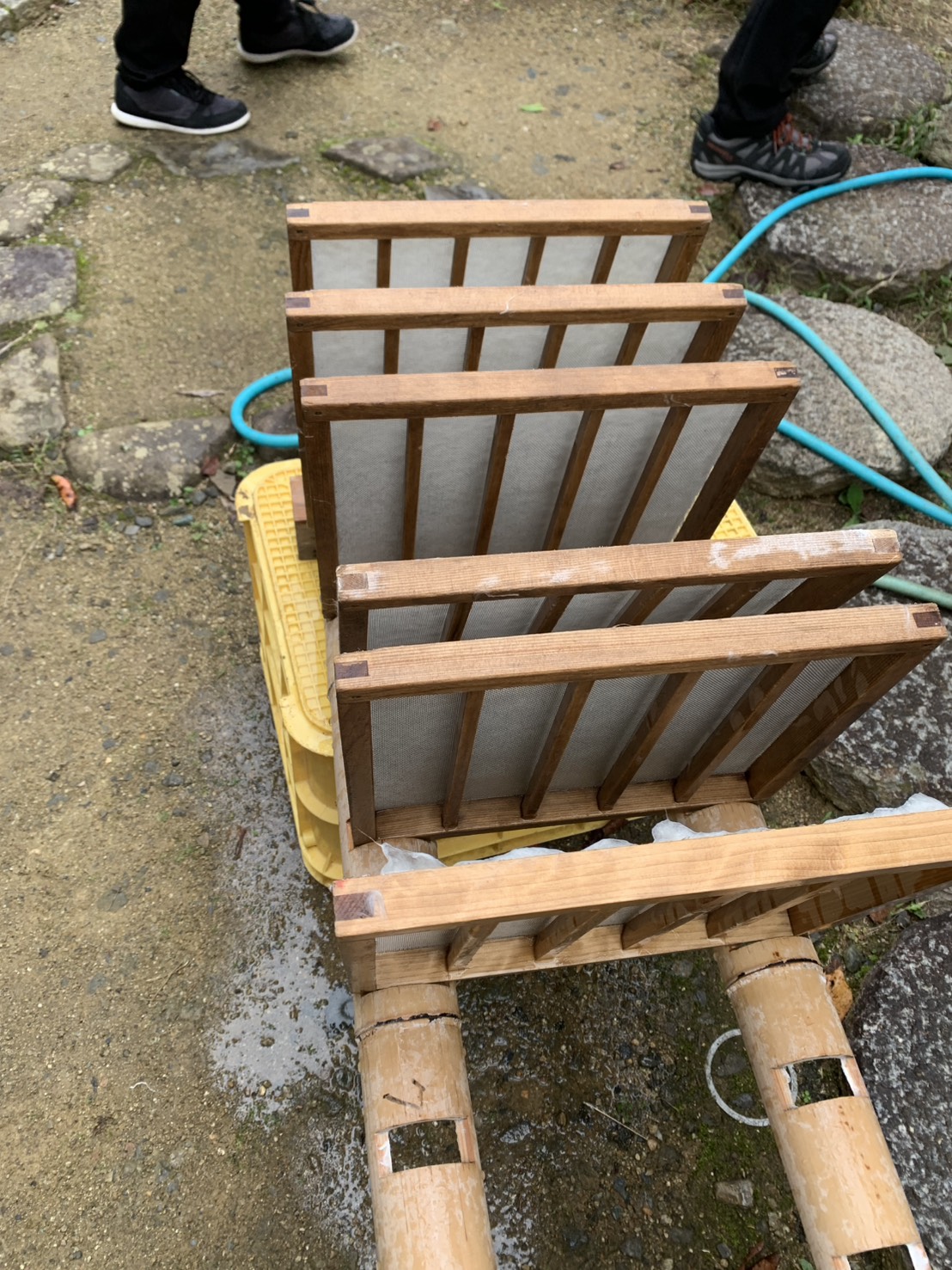 紙遊苑に12時頃着いて昼ご飯を食べて、紙漉きに臨みました。楮(こうぞ)の皮を蒸して叩いて茹でて、どろどろした液をすくって水分を切り、紙の元になる原材料を四角い網(漉き桁)ですくう作業を教えてもらい、楽しみながらも真剣に取り組みました。少し失敗をして再度チャレンジする人もいましたが無事終了しました。以前はたくさんの紙作りの作業場が有りましたが、和紙の需要が減り今は一軒もなく、伝統文化と技術を伝えるために紙遊苑だけになってしまったようです。漉き桁ですくった後、水切りの為に少し乾燥させその後板に張り付け本乾燥をして完成。数日後に送ってもらい、各自が作った漉き紙で卒業証書に仕上げ、3月18日の修了式に手渡される事になります。良い思い出になれば最高です。 (N/N K/K)