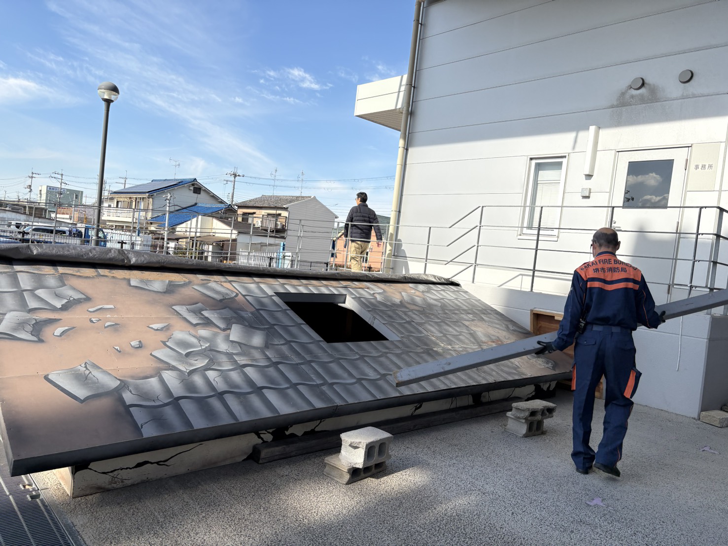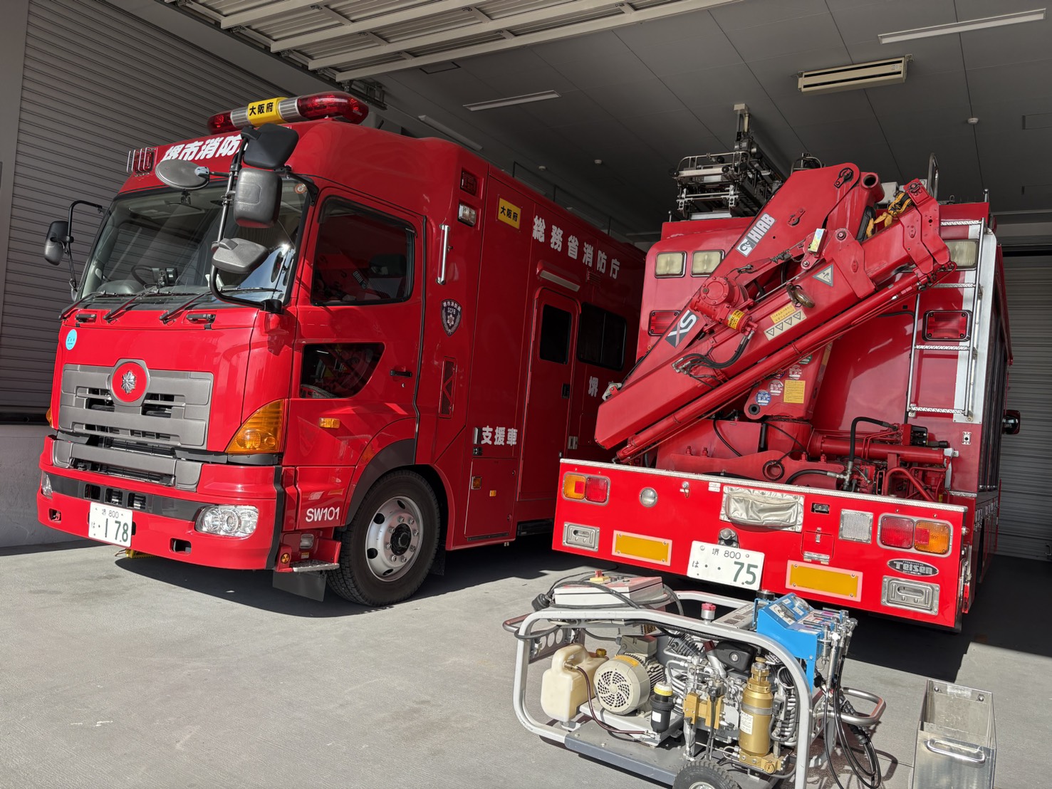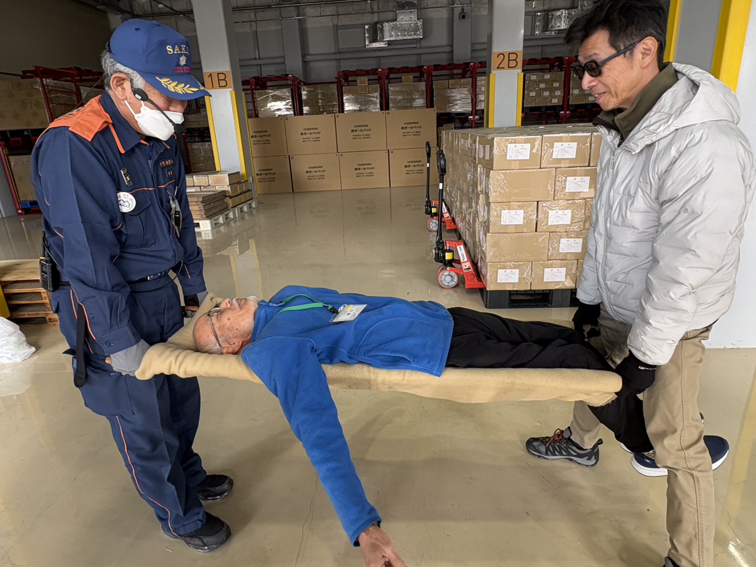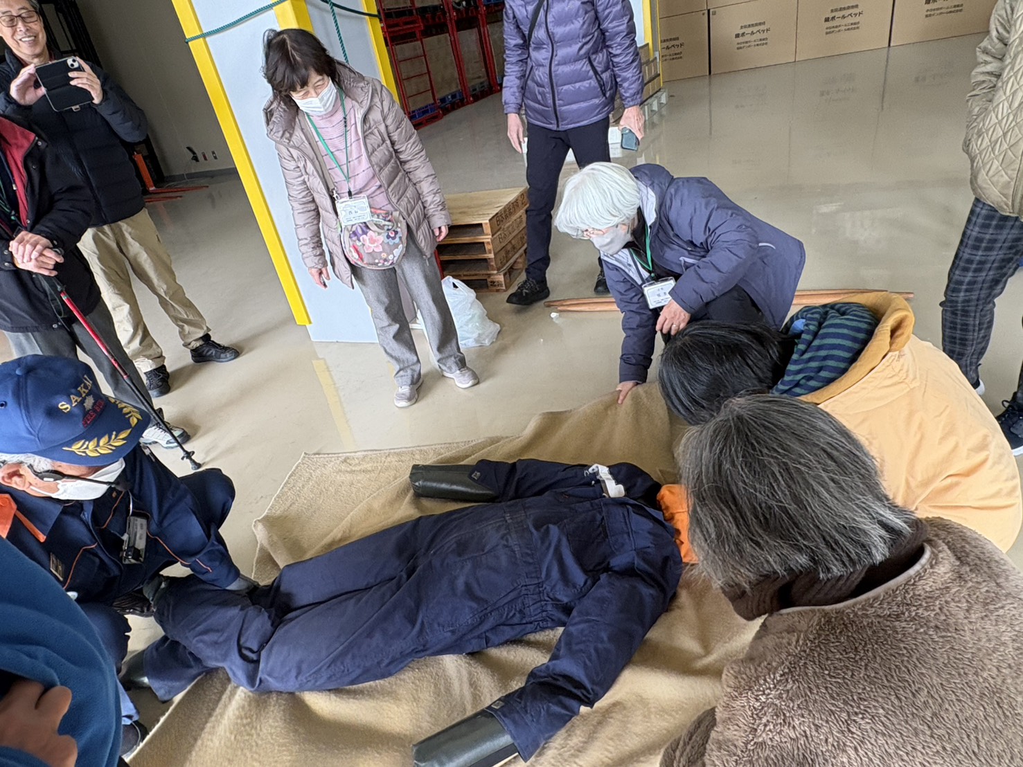 南海高野線初芝駅で10時に集合してバスに乗り、防災センターに到着後2班に分かれ講座開始。 早速消防訓練を見学しました。ドロ-ンを飛ばし、高層階からの救出や忍者のように壁を伝って降りる消防士さん、見たことない様な消防車もあり、迫力満点で値打ちがありました。 備蓄倉庫には、避難所で使う組み立て式のダンボ-ルベット、レトルト米、水入りペットボトル、オムツ、毛布などたくさんの種類や量が備蓄されています。重たい石が乗っている板の下になっている人(人形)を助ける救助体験では、何種類かのジャッキで板をあげ人(人形)を引っ張り出しました。これが簡単なようでなかなか難しい!! その後は毛布と棒二本で即席のタンカを作り前後二人で人形を乗せ運ぶ作業をしました。