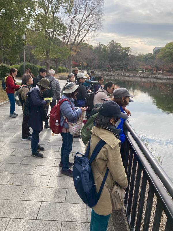森ノ宮駅から大阪城公園内に入り、広場にて再集合し、講座の内容は、野鳥の種類を追うのではなく、鳥の見つけ方や鳥のしぐさを感じる事が主になると説明されました。