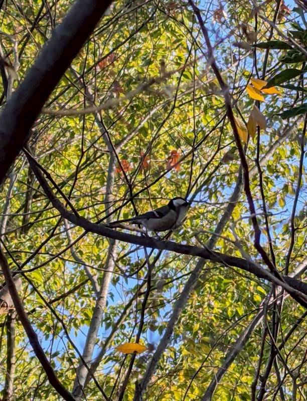 バードウオッチングをスタートさせてヒヨドリが群れで騒ぐ声が聞こえました。秋冬にかけて都会に、雪の降る地域から餌を求めて本州に南下してきます。通常の春から初夏にかけて倍以上に賑やかな事と感じておられるとの事でした。次にシジュウカラが目線の高さで姿を現しました。慌てて双眼鏡で見るよりも、シジュウカラが近づいてくるまで待ち、肉眼で十分に見られるまで双眼鏡は置いておきましょうと話をされました。次にカエデに止まったハシブトガラスの姿に受講生のみなさんは、今までの印象が変わってしまいました。望遠鏡で見たハシブトガラスの瞳に対し「かわいい」や「目がかわいい」と連呼し始めました。一般的にはゴミをあさる、追いかけられる、怖い黒い鳥というのが印象です。今回はこの瞬間にハシブトガラスの瞳の可愛らしさに気付かされました。