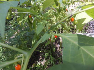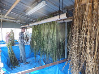 こうしてゴマを吊るし陰干しをする。手前の茶色のものは何日か前に干したもの