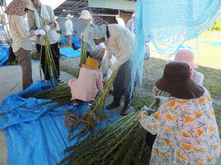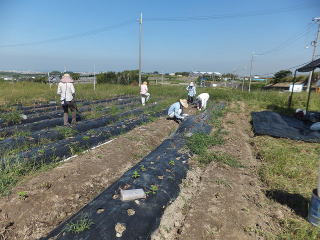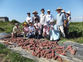 昼食後は場所を移しさつまいも掘り、土の中から次々と顔を出す赤いお芋に大歓声、その後ゴマを干すため農業公園に行き、初めて見るゴマの穂?にびっくりしながら教わったように束ね、括り、雨が当たらないところに干して今日の作業は終了です。