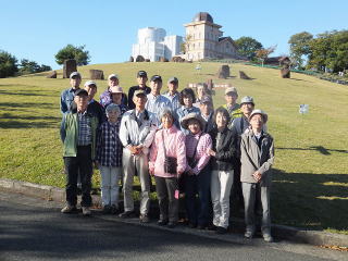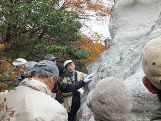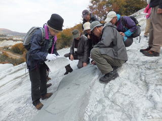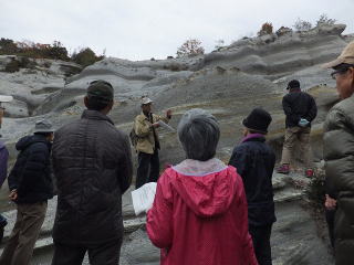 今日は眩しいくらいの朝日を浴びてなかもずを出発。同乗された佐藤先生はバスの中から講座を始められた。ふたかみ文化センターの博物館の案内を受けた後、二上山周辺の地層について、火砕流とは、また地層からなにがわかるのかの講義を受ける。