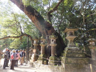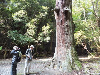 春日大社の前で集合し、大きな傾いたクスノキに迎えられ早速奥山遊歩道を歩き出す。途中秀吉が植えたという樹齢約400年の杉の大木が残る中、次ぎ次ぎと出て来る巨木に声をあげ、撫でたり、匂いを嗅いだりして登る。首切り地蔵で昼食を取り、遊歩道南部を通って引き返してきた。