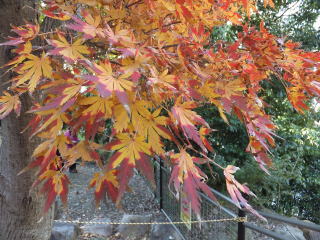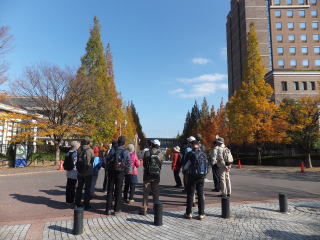 常緑樹に交じってイチョウの黄色、桜やハゼの赤で見事に彩られた道を歩きながら大型のオオタカから日本で最小のキクイタダキまで、34種ほどの野鳥に出会えました。