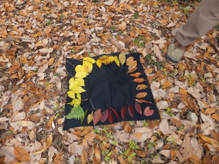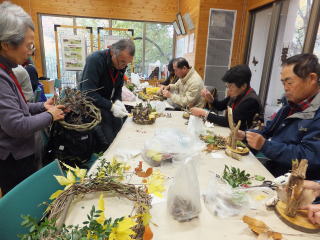 落ち葉で色のサークルを作り、それを細かくちぎり万華鏡にするとあちこちで感嘆の声があがる。教室にもどり賑やかな工作時間、同じような材料(どんぐり、木の枝、蔓)でよくこんなにと感心する芸術作品が出来上がりました。その後は忘年会が予定されていたので最高の出席率!!の講座となりました。
