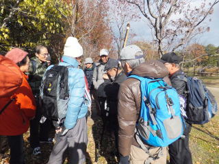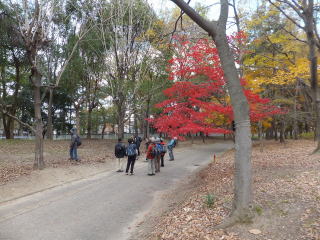紅葉の3要素 1、日光 2、温度(温度差、氷結しない程度の低温)3、水分がよかったのか今年の紅葉はとても美しい。葉色の変化のメカニズムの講義を受け、絶好の観察日和、和泉中央駅から徒歩で20分ほどの桃山学院大学を抜けて宮の上公園を歩いた。折りしも秋、木が実をつけ、紅葉した葉をまだつけていながらもう来年の用意をしっかりしている。