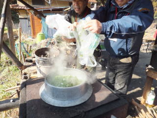 今年はゴギョウが見つからず、しかし持ち寄りの青菜やサトイモで山盛りの青菜を投入