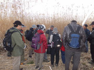 観察中のワンシーン、実は先生の手元から裸木の梢へ長い棒が延びている。