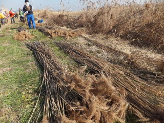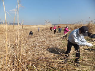 35年も前から鵜殿のヨシ原の保全に取り組む小山先生の指導の下、ヨシ刈りの現場とその選別を手伝いました。