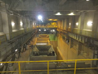 貯まった灰を埋立て場へ運ぶ、中央の大きな桝の下にトラックが待機