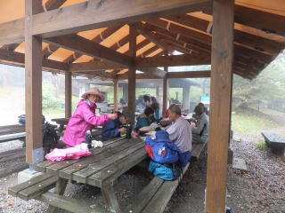 初めての雨の日の講座となった、しかも金剛山山頂。傘を叩く雨音がすごくて、正直先生の説明はあまり聞こえず、説明の申し送りをしながらの石楠花のみちを歩きました。
